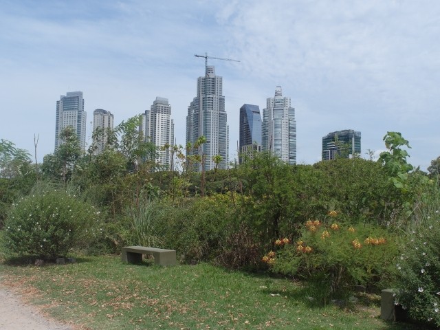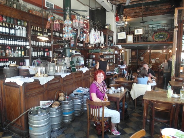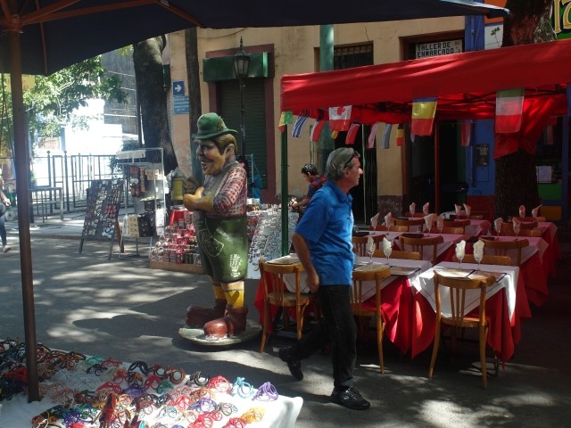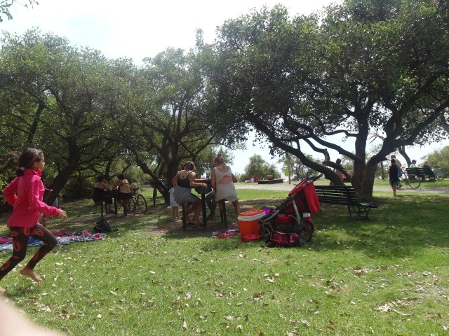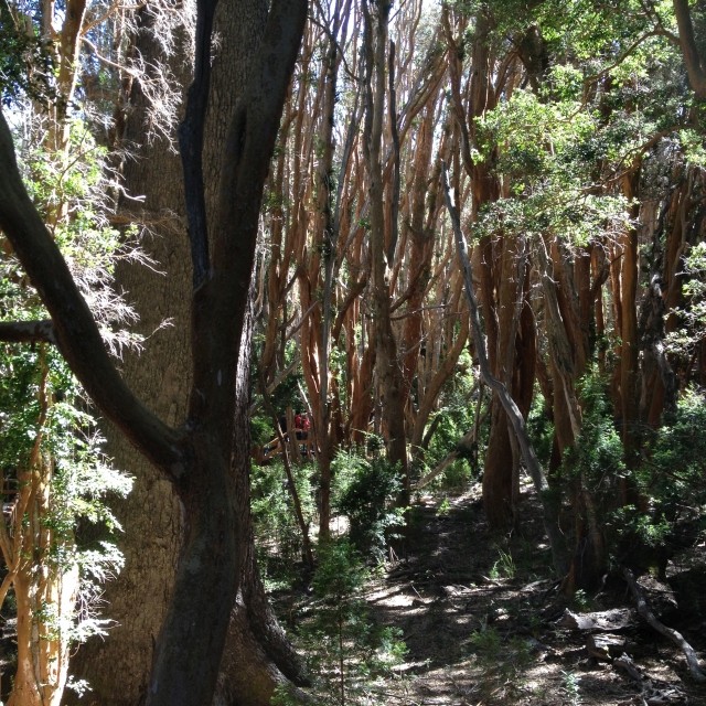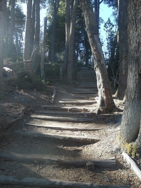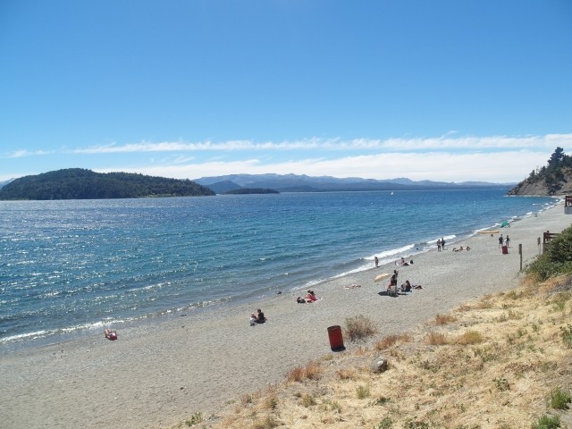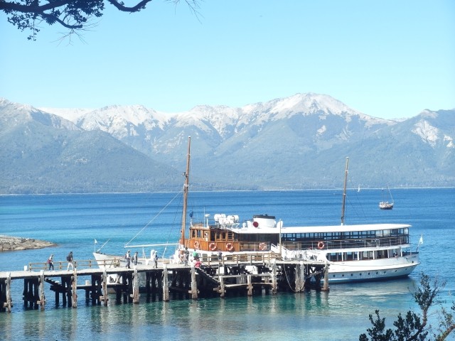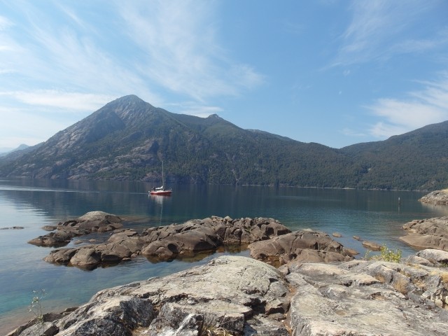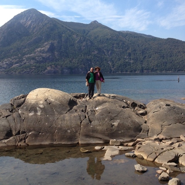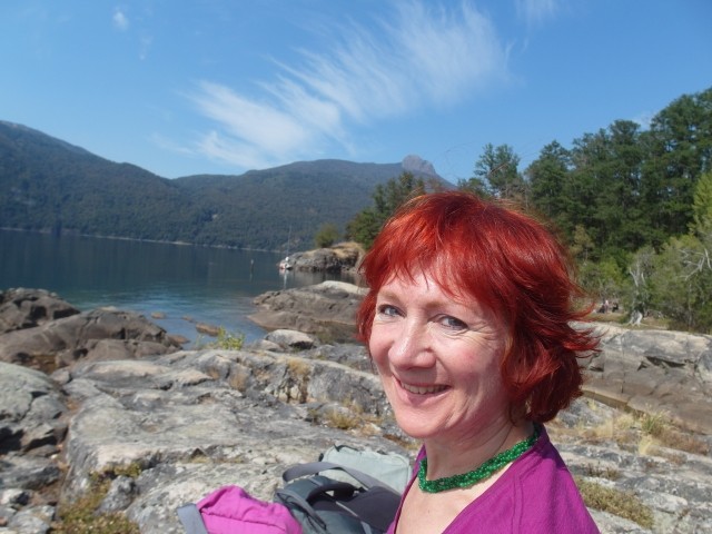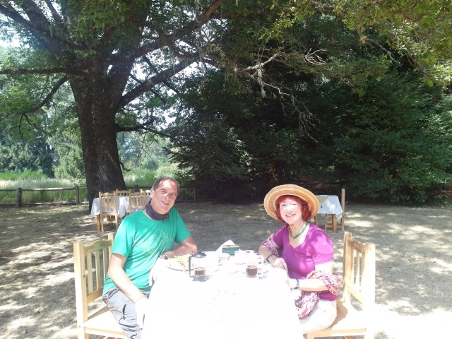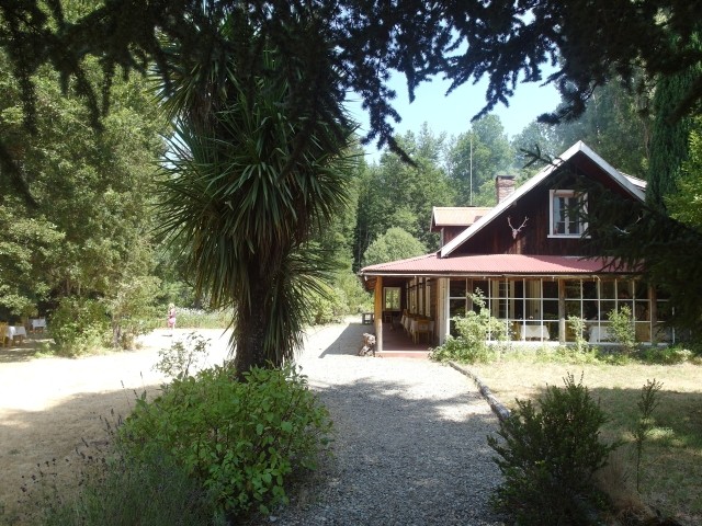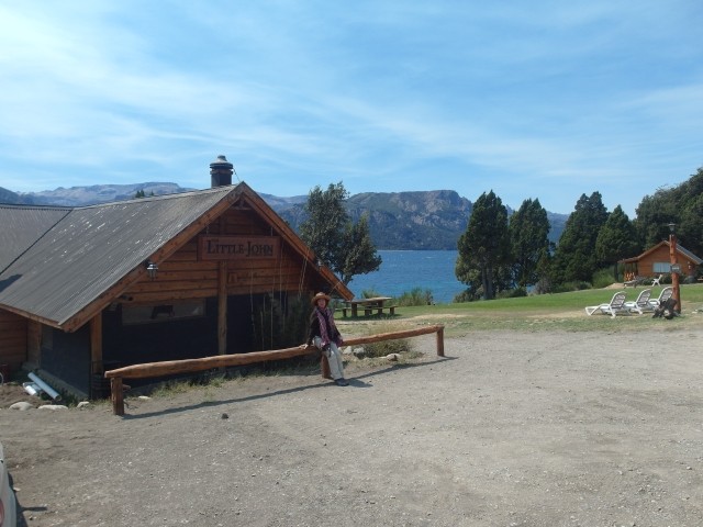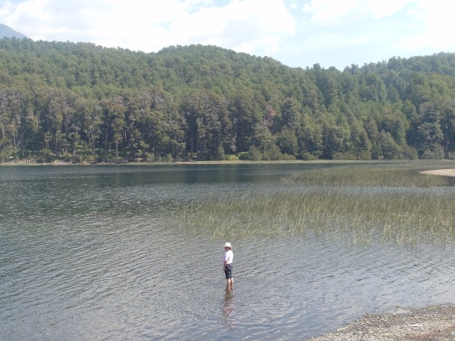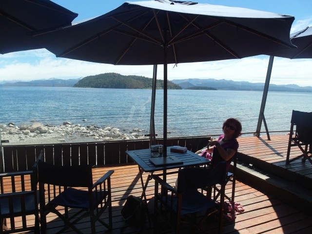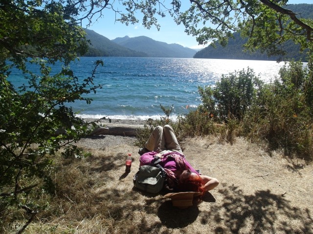 Es war ein friedliches, lauschiges Plätzchen, felsiger Strand, glasklares Wasser, auf einem Schild wurde vor der Kälte und Tiefe des Lago Lácar gewarnt. Dieter hat seinen Fuß hineingesteckt: so etwa16 Grad, meinte er. Gegen 12 Uhr mittags trudelten weitere aber wenige Urlauber ein, um, wie wir, auf den Felsen ein Sonnenbad zu nehmen. Weiter ging es nach Westen. Nach nur fünf Kilometern lockte ein Schild “Café” uns erneut von der Route ab. Es ging einen Kilometer lang auf einem schmalen Holperweg entlang – zwei Autos hätten nicht aneinander vorbei gepasst – bis wie aus dem Nichts diese Oase auftauchte. In einem großen, gepflegten Garten im Schatten von zwei mindestens hundert Jahre alten Eichen – zuerst dachten wir, die könnte nur ein deutscher Auswanderer hierher gebracht haben, aber dann dämmerte es uns, dass es sich wohl um die hier ebenfalls geschützten Borkeneichen handeln könnte – ließen wir uns mit einem Salat, Käsekuchen und Kaffee verwöhnen.