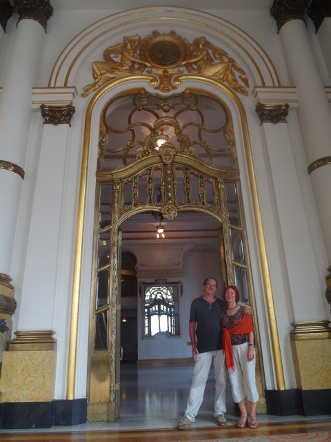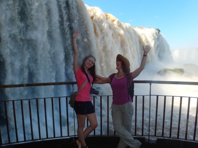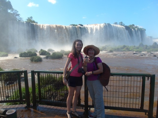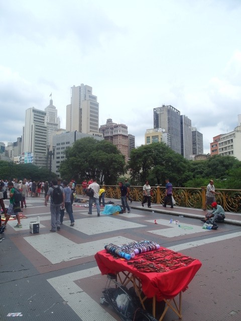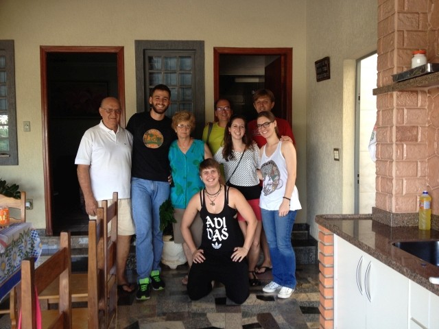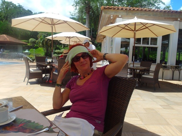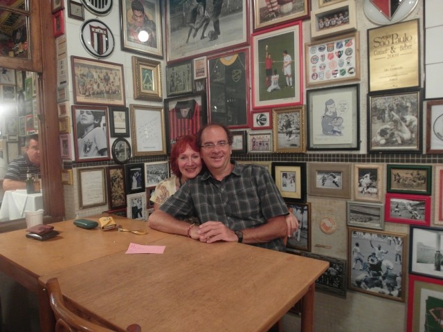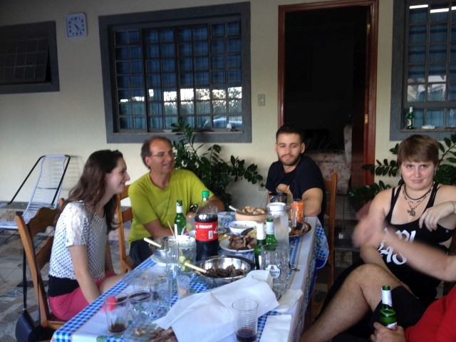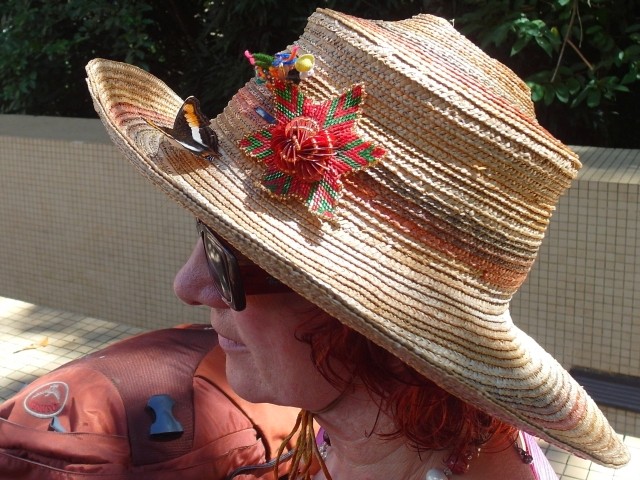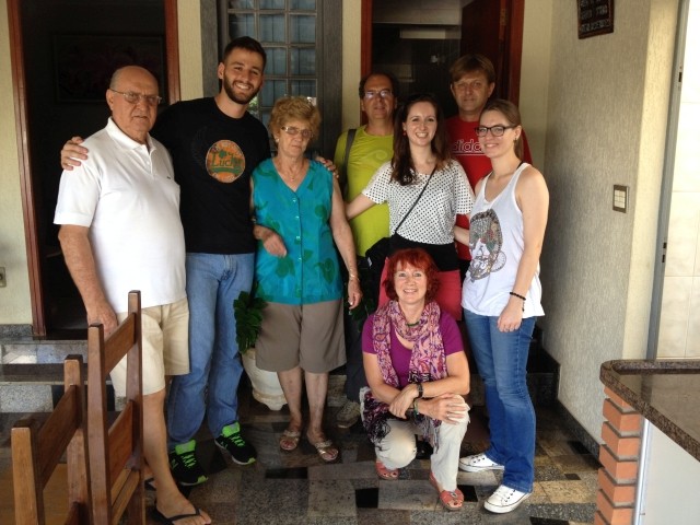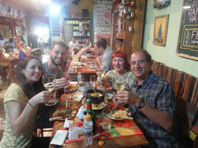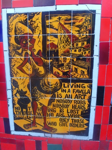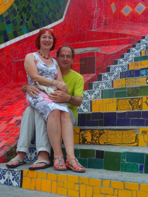 Wir konnten uns gar nicht satt sehen an den bunten Fliesen – es sollen über 2000 sein – wir entdeckten Hamburg, Berlin mehrfach, Quickborn – und plötzlich waren auch die Seitenwände gefliest. Man konnte darauf beliebig herumklettern, posieren und immer wieder staunen. Wir schlenderten weiter durch die Straßen, es ging wieder aufwärts, um Kurven herum, wir kamen durch eine Gegend, wo keine Touristen mehr unterwegs waren. Ein Bewaffneter stand mit einem Maschinengewehr an einer Ecke, er schien sich aber nicht über uns zu wundern. Links unten sahen wir eine Fawela, okay. Wir stiefelten weiter und kamen an einem wunderschönen Restaurant mit Aussicht vorbei. Obwohl heute Marlenes Geburtstag war, war es uns dort zu teuer, ohne sie zu feiern, und wir wanderten den Berg wieder hinunter. Es war schwierig, ein weiteres im Reiseführer empfohlenes Lokal zu finden. Nach einem zweistündigen Fußmarsch hatten wir es endlich geschafft. Wir ließen uns in einer netten Pizzeria nieder, wo mehrere brasilianische Familien sich zum Abendessen eingefunden hatten und verspeisten riesige, für eine Person viel zu große Pizzen, so gut wir halt konnten. Es hatte inzwischen angefangen zu regnen, wir saßen im Trockenen. Gelaufen waren wir für heute genug. Wir wollten ein Taxi zurück nehmen. Zwei Taxis wollten uns nicht fahren, nachdem wir den Fahrern die Adresse vor die Nase gehalten hatten. Sowas! Wir wussten nicht, warum. Beim dritten Versuch klappte es zum Glück und Dieter stellte zur Kontrolle sein Navi ein. Auf unserer schönen Dachterrasse ließen wir den Tag ausklingen.