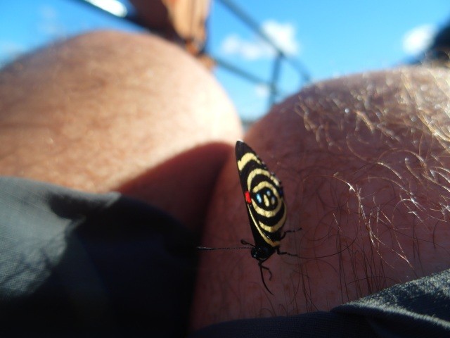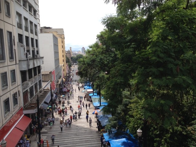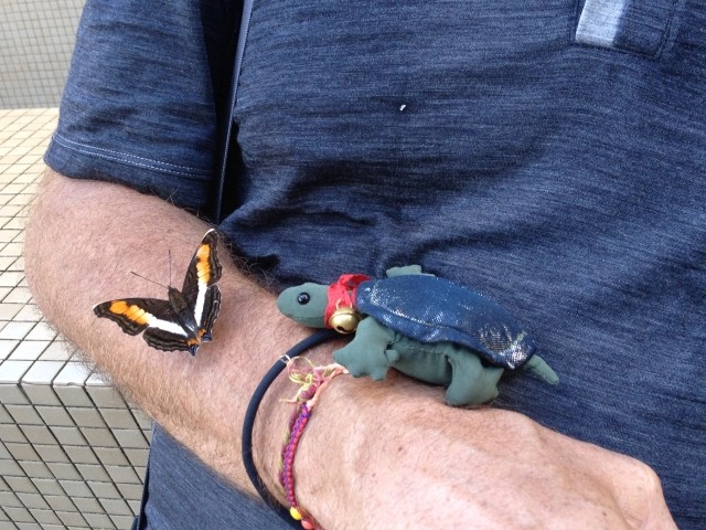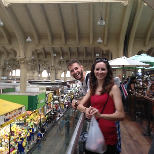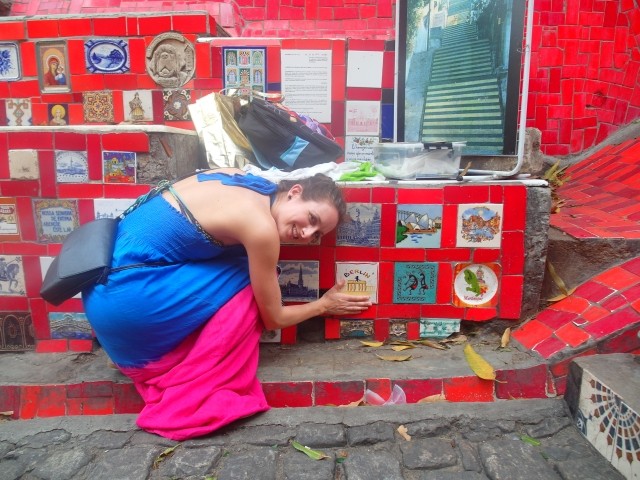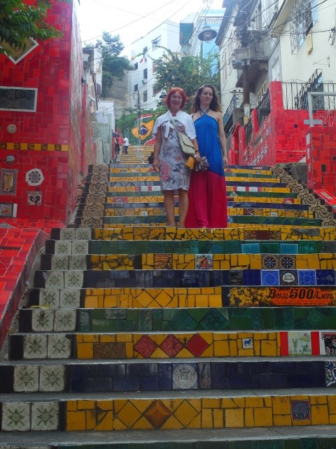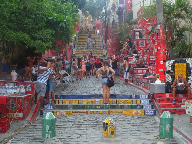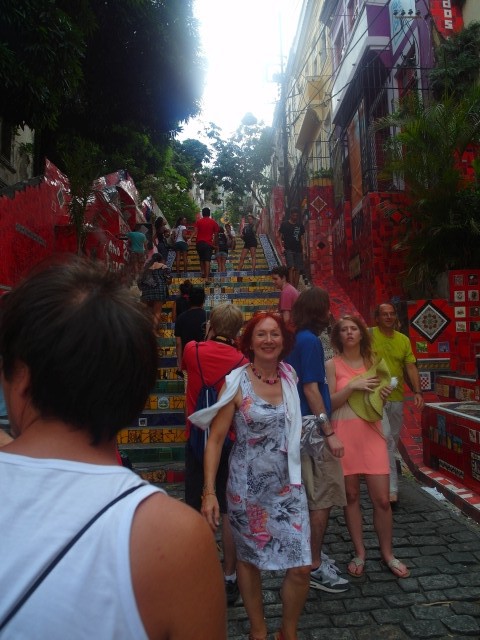 Wir hatten ein letztes, vegetarisches Frühstück in unserem gemütlichen Hostel, dann beluden wir unseren eleganten Chevrolet, und los ging es durch die morgendliche Rushhour von São Paulo zur Autorückgabestation. Zum Glück war unsere Pension nicht weit davon und vom Flughafen entfernt, nur etwa 15 Kilometer. Dennoch brauchten wir über eine halbe Stunde. Es klappte wieder hervorragend. Einer von der Autovermietung fuhr uns zum Flughafen und gegen 11:40 Uhr starteten wir nach Río. Schon beim Anflug auf den Santos Dumas Flughafen konnten wir den Zuckerhut und den Cristo sehen. Es war äußerst schwül und heiß in Río. Ein Taxifahrer stand für uns bereit und fuhr uns in unsere Bed&Breakfast-Pension. Das Taxi schraubte sich durch verwinkelte Gassen mit Kopfsteinpflaster mühsam die Serpentinen hoch, wir hatten schnell jegliche Orientierung verloren. Chiara begrüßte uns an der Rezeption und zeigte uns unser gemütliches, kleines Dreibettzimmer – über dem Doppelbett war ein Hochbett für Kimi. Alles war ausreichend, und wir konnten unser Gepäck gut unterbringen. Chiara meinte, dass wir abends allerdings immer ein Taxi nehmen sollten, da die Gegend hier oben dunkel und nicht so sicher sei. Über uns war eine super Dachterrasse mit genialem Ausblick über die Guanabara- Bucht, die Skyline von Río und unseren Ankunftsflughafen. Alles bestens. Wir machten uns frisch, und auf ging es auf Erkundungstour unserer Umgebung. Nach nur fünf Minuten Fußweg, rauf und runter, kamen wir an eine Treppe, die von oben nicht weiter besonders aussah. Aber auf der nächsten Etage schon standen ein paar Touris, die eifrig dabei waren, Fotos zu machen, und die ganz begeistert aussahen. Wir stiegen ein paar Stufen hinunter, und da sahen wir es auch: Wir standen mitten in einem Kunstwerk, das sogar als weltweit größte bildhauerische Arbeit aus der Hand eines einzelnen Künstlers gilt, wir standen auf der berühmten Fliesentreppe von Jorge Selarón. Und die war in der Tat viele Fotos wert.