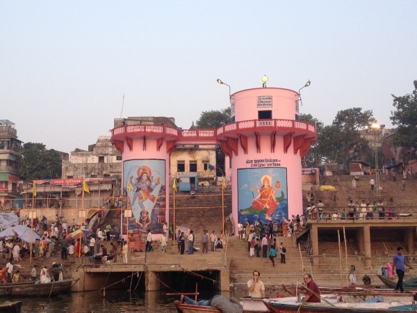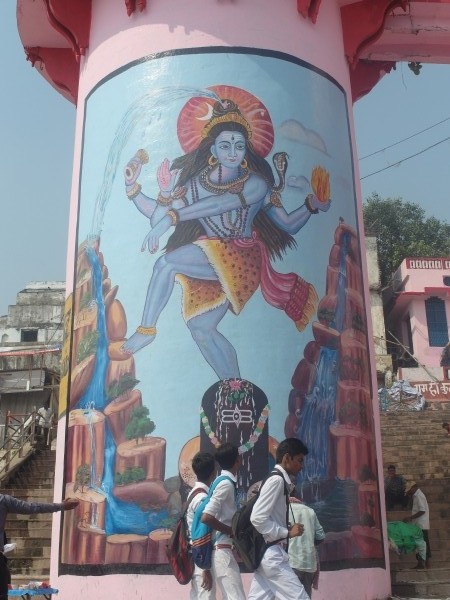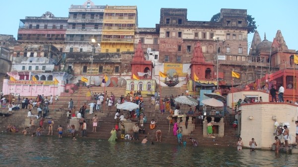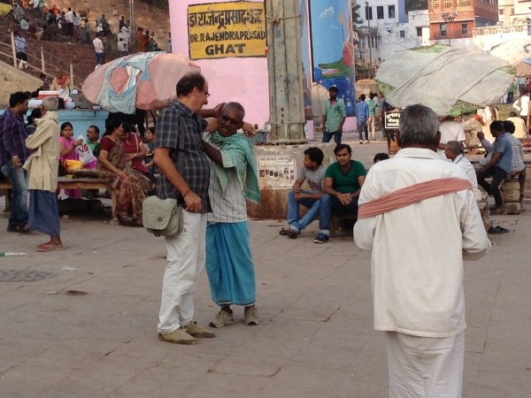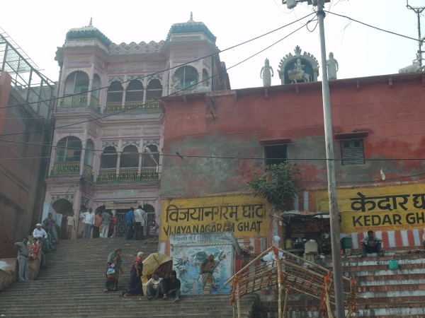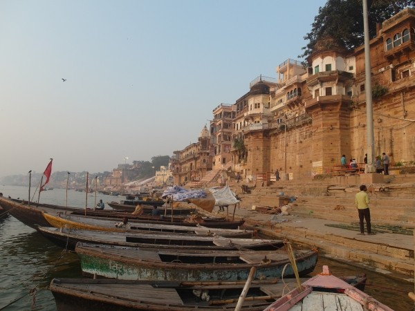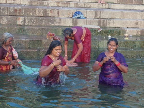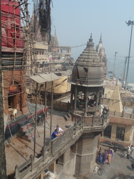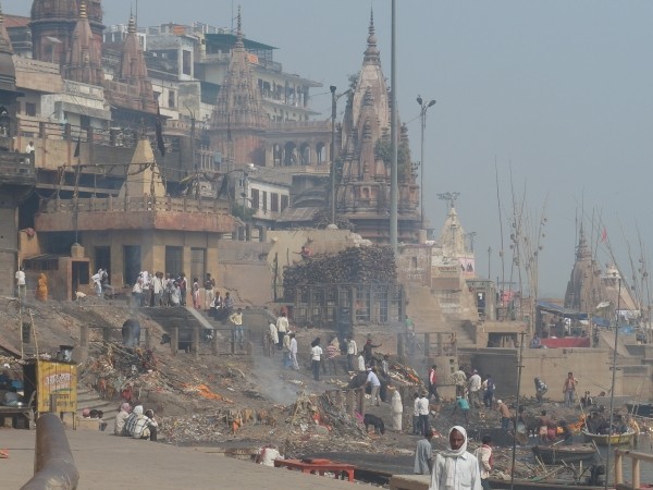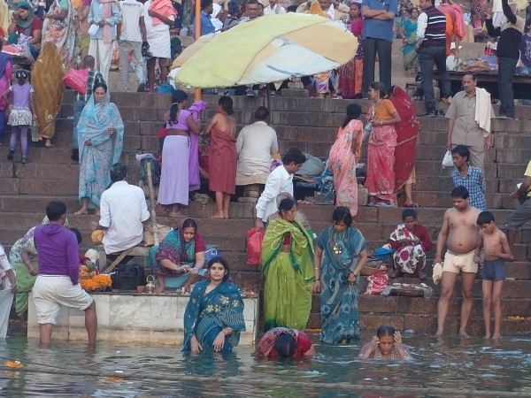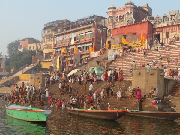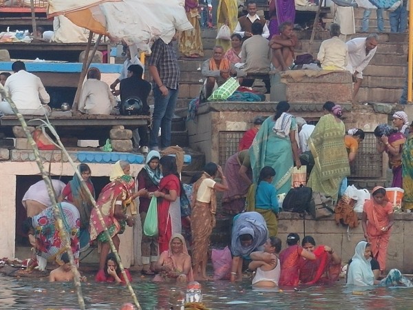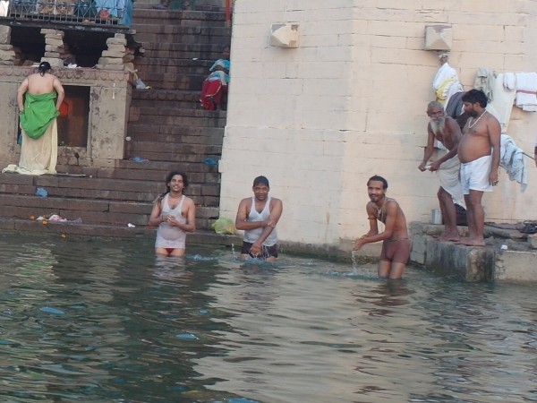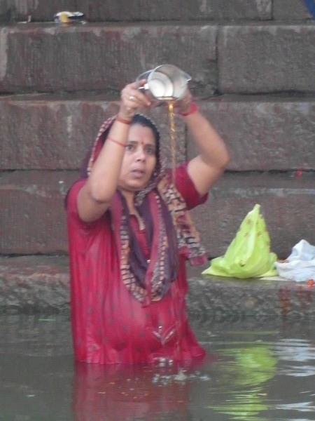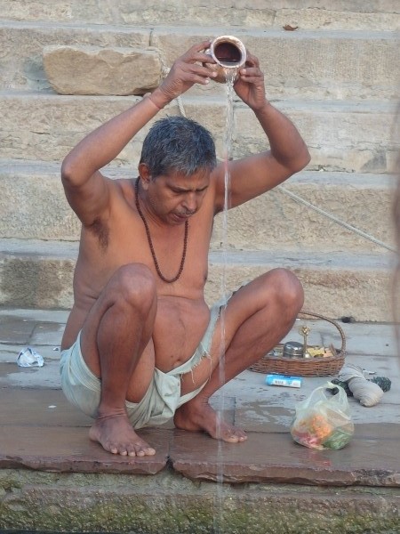 Wir standen um halb sechs zur Sonnenaufgangsfahrt auf dem Ganges bereit. Zwei junge Pärchen aus Russland, auch aus unserer Pension, waren dabei. Wieder ruderte Dabloo, der Hausangestellte, der auch schon die Abendfahrt mit uns gemacht hatte. Ich hatte mich nicht warm genug angezogen, vielleicht war es auch einfach etwas zu früh: Ich habe gefroren. Es war mal wieder incredible zu sehen, wie sich Tausende von gläubigen Indern glückselig und fromm in die heiligen Fluten stürzten, sich wuschen, sich Gangeswasser über den Kopf gossen, ein paar Mantren murmelten oder auch sangen – keine der Frauen schien zu frieren trotz der nassen Saris. Von Touristen fotografiert werden nach der “Reinigung”, immer wieder gern und häufig mit einem Lächeln und fröhlichem Winken.