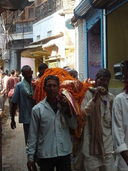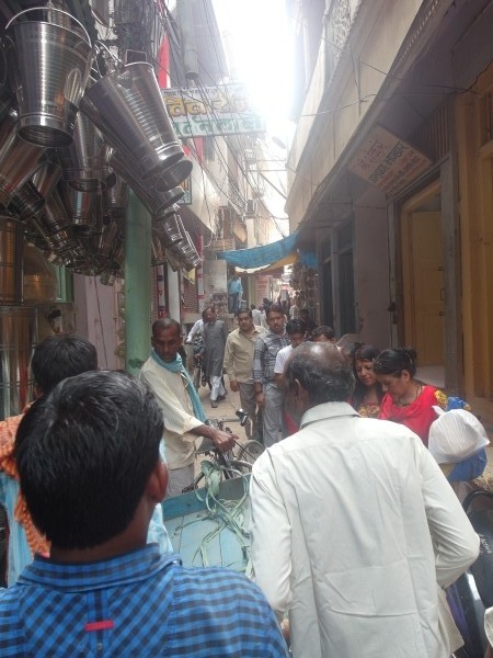 Wir haben uns heute noch einmal jeder eine Stunde lang durchkneten lassen, ich morgens, Dieter abends. Ja, das macht schon ein bisschen süchtig! Gegen elf ließen wir uns in ner Motor-Rikscha zum Museum fahren. Hatte geschlossen. Wieder irgendein Feiertag, oder die Vorbereitung dafür, ein Grund findet sich immer. Dieter wollte es dann noch einmal mit dem “Goldenen Tempel” probieren. Fünf Tage hier in Varanasi gewesen sein, und den nicht gesehen haben, das ging für ihn gar nicht! Wieder per Motor-Rikscha in die Altstadt, bzw. bis dorthin, wo sie fahren dürfen. Und rein ins Gedrängel. Also für Menschen mit klaustrophobischen Zügen ist das hier nichts! Irgendwann standen wir in einer 1,50 Meter breiten Gasse, vor einer Sicherheitsschleuse, sehr viel bewaffnete Polizei, oder Militär war zugegen. Dieter fragte einen Uniformierten, wo denn der Tempel sei, und ob wir da rein dürften. Der meinte ab 18 Uhr für Nicht-Hindus. Wir retteten uns auf die nächstgelegene Dachterrasse zum Lunch. Dieter wollte immer noch nicht aufgeben. Mann, kann der hartnäckig sein! Wieder in die Gassen, wieder zwei, drei Polizisten fragen, dann standen wir vor derselben Tür. Es hieß, wir müssten unsere Mobiltelefone und Kameras abgeben, in Schließfächern aufbewahren, dann dürften wir durch die Sicherheitsschleuse. Ich fühlte mich plötzlich trotz Massage am Morgen doch wieder äußerst unwohl. Diese Menschenmassen, diese für uns so unverständliche Religiosität, und dann gleich hinter dem Hindu-Tempel zwei Moscheen – da braucht nur mal jemand auszuflippen… Dieter wollte da rein. Was sollte ich machen? Wir warteten geduldig auf das Zeichen des Sicherheitsbeamten. Ab durch den Scanner, Bodycheck, dann waren wir drin. Um uns herum wurde ein klein wenig weniger gedrängelt. Lauter Devotionaliengeschäfte, ein Tempeleingang mit bewaffnetem Posten: “Sorry Sir! I think you are not allowed!” Wir gingen zum nächsten Eingang, zum Annapurna-Tempel. Annapurna, auch so ‘ne Hindu-Göttin, da waren wir doch auf Trekkingtour! Na also, wir durften rein. Noch immer hatten wir keine goldenen Türme gesehen. Wir fragten einen Verkäufer, und er ließ uns in seinen Laden. Tatsächlich, da waren sie! Wir konnten über die Mauer hinweg die goldenen Türme des Vishwanatha-Tempels erblicken. Dieter war entzückt und ich erleichtert. Zurück ins Hotel, Dieter bekam seine Massage.