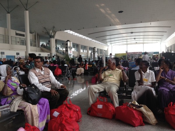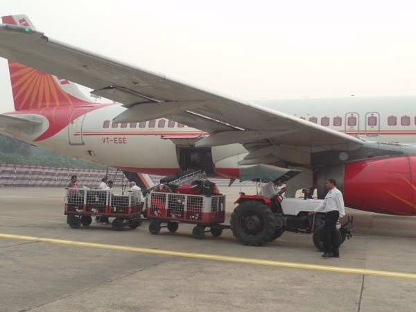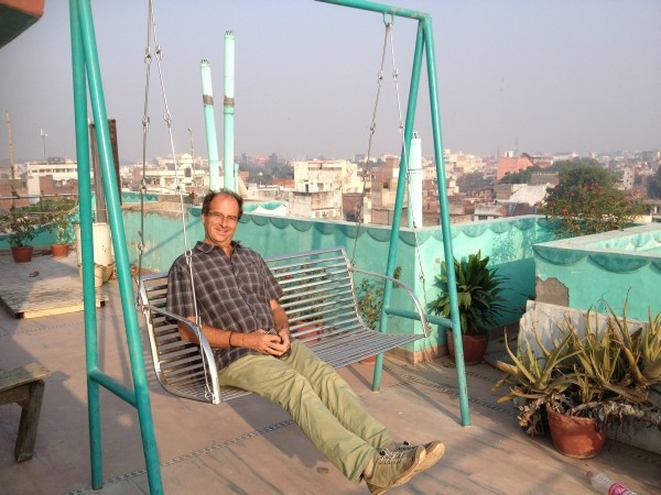 Ein letztes Foto von der Dachterrasse, tschüss zu unserem  Gastwirt – bei uns würde man ihn für den absoluten Loser halten, niemals für einen wohlhabenden Geschäftsmann  mit zwei Gästehäusern direkt am Ganges: Er ist klein und unscheinbar, kaut, wie viele Inder, Bethel, weshalb er ständig rote Spucke im Mund hat – äußerst unästhetisch anzusehen – doch hier ist er der Boss, und alle Angestellten buckeln vor ihm. Wir fanden ihn nach einer kleinen Gewöhnungszeit äußerst freundlich, hilfsbereit und sympathisch. Er hat einen cleveren Manager, der immer zu Späßchen aufgelegt ist, aber gleichzeitig penibel genau über die Zahlen, Geschäfte und Gäste wacht. Und Dabloo, unser Ruderer, verdingte sich auch schon mal als Kellner oder Maler. Arvinds Gästehaus, wo in den unteren Stockwerken indische Familien wohnen, durch deren Wohnzimmer man immer lief, wenn man die Treppe hoch ging, wurde nämlich gerade angestrichen. Allein dadurch hebt es sich von den umstehenden unverputzten, unfertigen oder auch baufälligen oder ständig sich in Aufstockung befindlichen Nachbarshäusern als schönstes ab. Ansonsten wuselten immer noch mindestens fünf andere Mitarbeiter herum, die alle für Arvind als Kofferträger, oder Wegweiser oder Boten oder Reinigungskräfte oder Küchenhilfen  beschäftigt waren. Frauen gab es keine. Um 8:45 Uhr saßen wir im Taxi zum Flughafen. Hoffentlich würden wir nicht zu viel Übergewicht haben! Am Flughafen zeigte die Waage: zusammen 32 kg. Das war im Rahmen, wir brauchten nicht nachzahlen. Der Flug hatte ca. eine Stunde Verspätung.