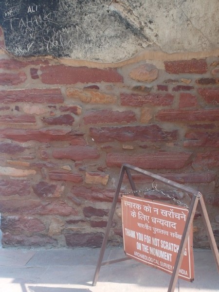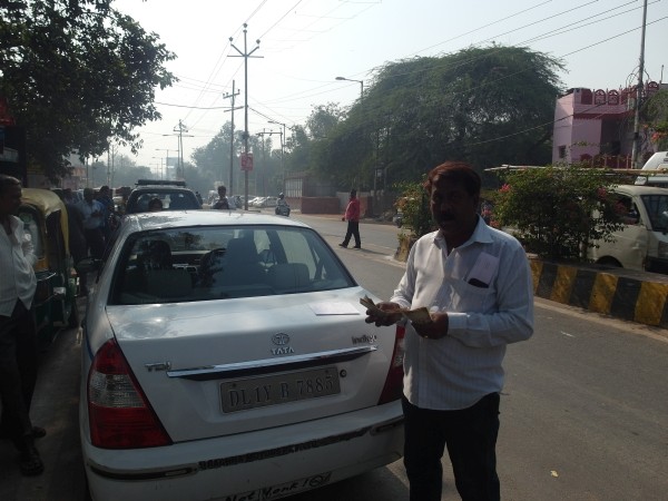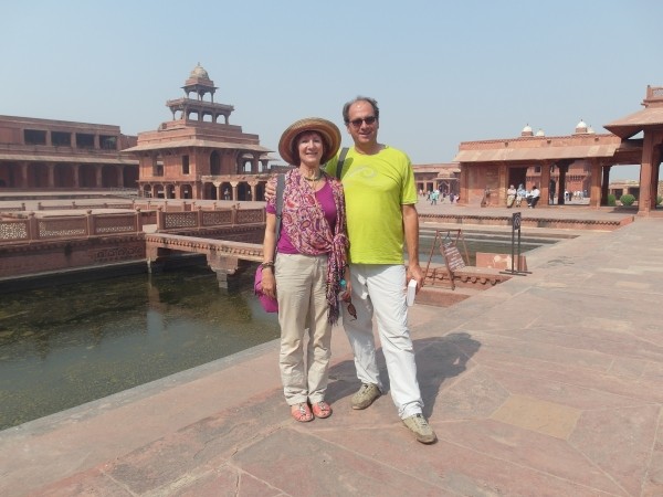 Bis auf dass wir es hier in Indien noch nicht geschafft haben, wie geplant, mit unserer Visa Karte zu bezahlen, hat alles prima geklappt. Gegen zehn Uhr stand unser von Deutschland aus organisierter Fuhrunternehmer, Ashoks Taxi Tours, vorm Hotel, und wir warteten zusammen im Frühstücksraum auf seinen Fahrer. Der Herr über inzwischen zwölf Mitarbeiter gab uns kurze Handlungsanweisungen, dass wir bei allen Besichtigungen nicht auf falsche Guides hereinfallen sollten, uns nicht in irgendwelche Emporiums schleppen lassen sollten…Gebont! Seine Kunden stammten meist aus Deutschland, und er hätte dort seinen deutschen Webdesigner sitzen, der ihm für umme seine Homepage gestalte. Er sei ein Hindu-Brahmane, sollte wohl heißen, höchstangesehenen Ursprungs, sollte wohl den Wert seiner Dienstleistungen für uns erhöhen. Auf Nachfrage erzählte er, dass er drei Kinder habe und schon vier Enkelkinder. Nur eine Hochzeit müsse noch arrangiert werden. Nächstes Jahr sei es wohl soweit. Ich habe ihm erzählt, dass unsere Kinder solche Arrangements nicht akzeptieren würden. Er lachte und meinte, hier in Indien sei es aber so. Ajit, sein Fahrer kam. Auf der Kühlerhaube des mindestens acht Jahre alten Tatas, gut sichtbar für alle umstehenden Rikscha-Fahrer und Imbissverkäufer, wurde unsere Anzahlung abgezählt und noch einmal gezählt. Alles stimmte.