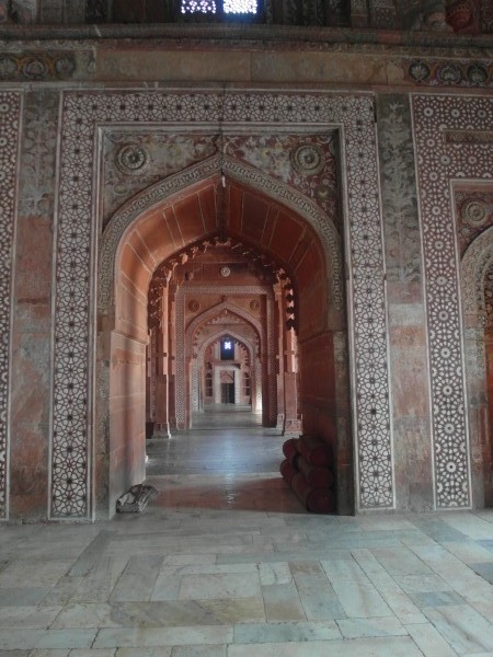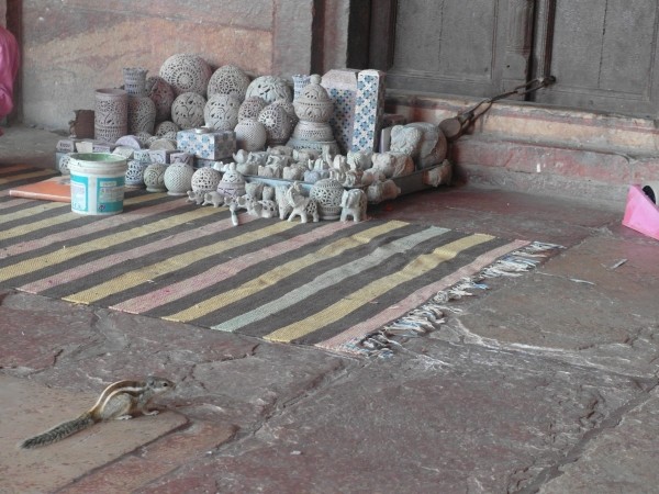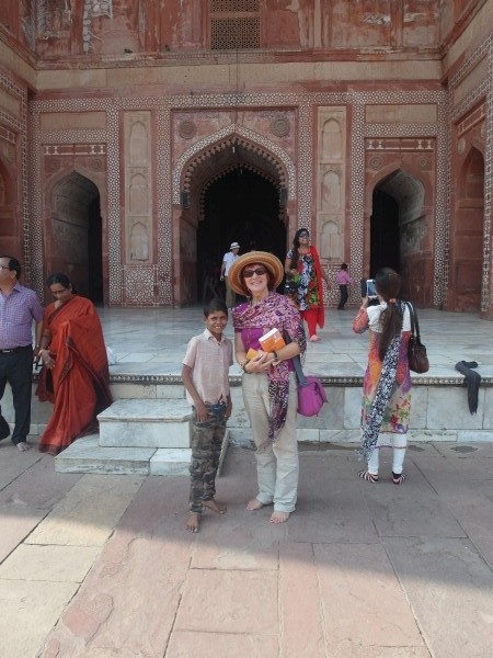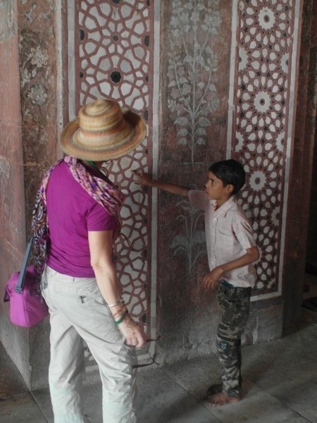 Dann bekam Ajit einen Teil und los ging’s.Nach Fatehpur Sikri, Großmogul Akbars einstigem Machtzentrum im 16. Jahrhundert, etwa 40 Kilometer westlich von Agra. Akbar war der, der versuchte, Menschen verschiedener Religionen unter einen Hut zu bringen und als tolerante Geste drei Frauen verschiedenen Glaubens heiratete. Ein indischer “Nathan, der Weise”. Wie Kletten versuchten sich in Fatehpur die Guides und Händler an die Touris zu heften. Wir waren gewarnt und abwehrbereit. Dachte ich. Doch als ein kleiner, gewiefter Zehnjähriger, Raoul, nicht von meiner Seite wich und mir die ganzen Stories von Akbar und den Kachelmustern, und den Haremshäusern, und dem Mausoleum von Sheikh Salim Chrishti sowieso einem Elefantengrab, von dem ich selbst im Reiseführer noch nichts gelesen hatte, in bestem Englisch erzählte, war ich tief beeindruckt und zückte in Gedanken schon meine Rupienscheine. Ich mochte den Kleinen. Das merkte er und führte mich irgendwann zielstrebig zum Verkaufsstand seines Onkels. Ja, ich habe ihm was abgekauft, und obwohl ich nur ein Drittel des zuerst geforderten Preises für den Löcherelefanten bezahlt habe, war das kleine Souvenir 100-prozentig selbst davon weniger als ein Drittel wert! Shame on me! Beim Feilschen bin ich immer noch eine Niete. Hoffentlich hat Raoul wenigstens ein Trinkgeld von seinem Onkel bekommen!