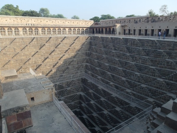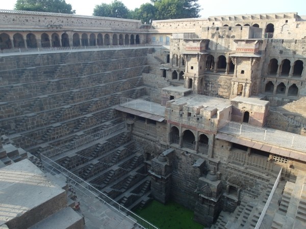 Gegen drei Uhr fragte Ajit uns, ob wir eine Pause machen wollten. Wir wollten nicht, aber er war hungrig. Er warnte uns, dass wir nichts kaufen sollten, weil es für Touris hier äußerst teuer sei, aber wir könnten uns ja ins Auto setzen. Nach dem Genuss einer in der Tat völlig überteuerten Cola warteten wir zehn Minuten auf ihn, was Dieter nicht akzeptieren wollte: das hätte es bei Lal nicht gegeben! Wir wollten vorgeben, wann wir Pause machen, und wir wollten nicht auf ihn warten müssen. Es stellte sich als ein Missverständnis heraus: Der arme Kerl war heute Morgen um vier Uhr aus Delhi gekommen und hatte einfach Hunger. Gut, dass wir mal drüber gesprochen hatten! Etwa 95 Kilometer vor Jaipur entfernt machte Ajit einen Abstecher zum Chand Baori, einem riesigen im 8. Jahrhundert angelegten Wasserbecken, zu dem man über zahllose Steinstufen hinabsteigen konnte. Bei großer Dürre und Hitze kamen die Menschen aus dem Dorf hier im neunten Jahrhundert zusammen, denn unten war es fünf bis sechs Grad kühler als oben. Daneben gab es eine Tempelruine. Einzelne Säulen- und Altarreste daraus – kunstvolle Steinmetzarbeiten – wurden rings um die Anlage herum ausgestellt.