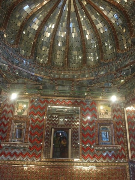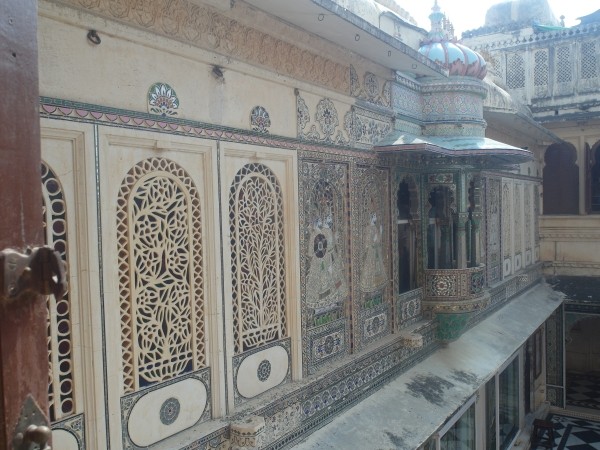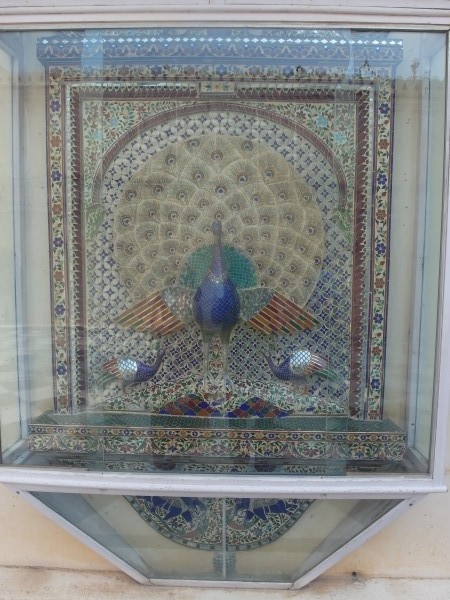 Heute war der Stadtpalastkomplex von Udaipur dran. Wir nahmen uns ‘nen Audio-Guide, so dass wir zusammen und mit Hintergrundinformationen berieselt durch die Paläste ziehen konnten. Und wieder gab es kunstvoll gestaltete Höfe, Gärten, Wohnbereiche, Gitterfenster, Bassins, Balkone, Säulengänge, Kacheln, Pfauen-Mosaike, Gemälde, Kostüme, Senften … vom Beginn der Stadtgründung durch Udai Singh II. in der Mitte des 16. Jahrhunderts bis heute.