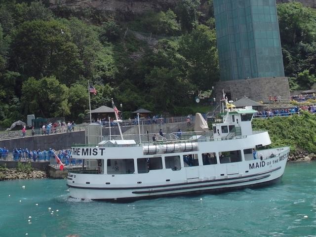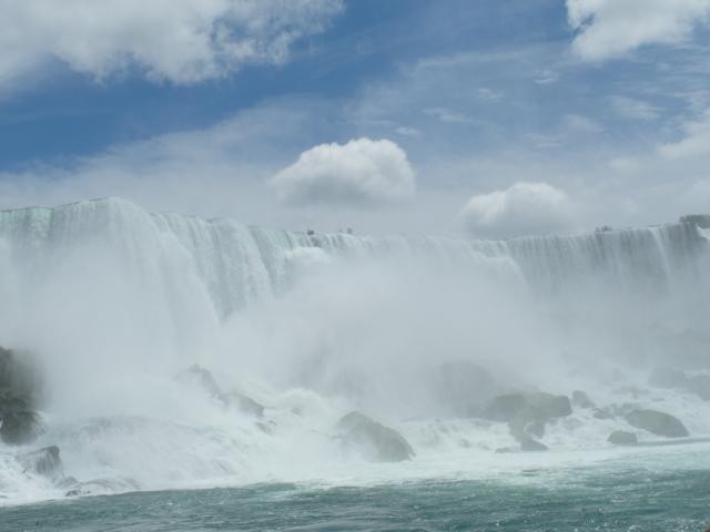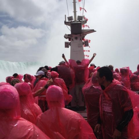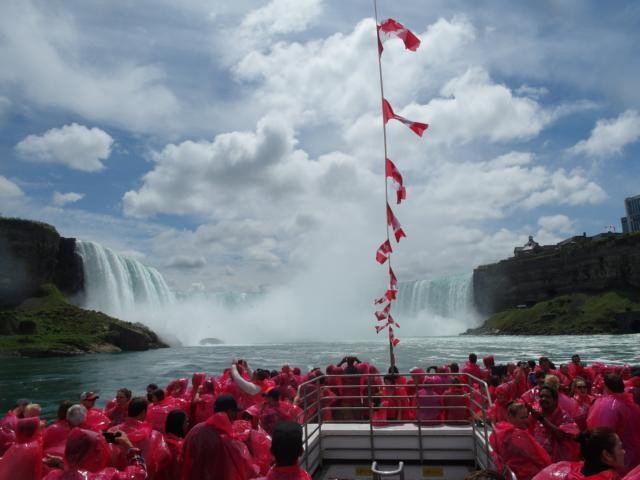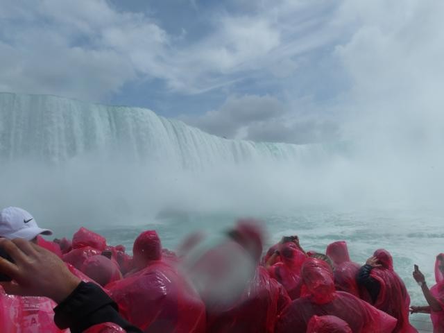 Wir halten vor einem der drei Theater. Schauspielkunst scheint hier äußerst beliebt zu sein. Besonders beim Shaw-Festival soll es bis zu acht Vorstellungen am Tag in jedem Theater geben und alle sollen immer gut besucht sein, meint Scott. Wir haben eine dreiviertel Stunde Aufenthalt in diesem sagenhaften Ort. Alles wirkt künstlich, übertrieben, von den geschnittenen Rasenkanten und sauberen Bürgersteigen, über die Superlative, mit denen das Eis angepriesen wird – es soll das beste Kanadas sein – wir haben es probiert, es ist vor allem teuer, bis zum “Just Christmas”- Highlight, auf so was haben wir ja schon lange gewartet! Manno, wir wollen doch nur zu den Wasserfällen! Nächster Stopp: bei einer Seilbahn, in der man über den Fluss schweben kann. Wegen einer besonders guten Aussicht? Keine Ahnung. Die Menschen stehen jedenfalls Schlange. Nächster Stopp: Bei den Hubschraubern. Wer möchte kann einen Helikopterflug zu den Fällen dazubuchen, nur 120 CAD. Drei Leute steigen aus. Nächste Station: Unter einer Brücke. Wir lernen alle die drei Wörter “under the bridge” auswendig, weil wir uns hier um pünktlich viertel nach vier zur Rückfahrt treffen sollen. Dann endlich: Aussteigen. Wir bekommen Tickets für die Boote in die Hand gedrückt, wir können los. Jippie, Niagarafälle, wir kommen! Schnell in die Schlange für die Fahrstühle gestellt, nach unten transportiert, mit Tausenden von Menschen aller Nationen sich langsam und freudig Richtung Boot bewegt, ein rotes “Hornblower”-Cape aus Plastik übergeworfen, wir betreten das Boot. Und da sind sie, die amerikanischen Niagarafälle. Aus etwa 50 Metern Höhe stürzen sich Abertausende von Kubikmetern Wasser nach unten. Gigantisch. Umwerfend. Am Land auf der amerikanischen Seite wimmelt es von Menschen mit blauen und gelben Capes. In einem sicher genau ausgetüftelten Takt bewegen sich mal die kanadischen, mal die amerikanischen Boote in Richtung Horseshoefalls, den kanadischen Niagarafällen, und kreisen in ehrerbietenden Verneigungen vor diesem Weltwunder hin und her. Es spritzt, es wird gekreischt und gelacht, wir sind dem spektakulären Naturschauspiel sooo nah, es ist atemberaubend. Und dann geht es auch schon wieder zurück.