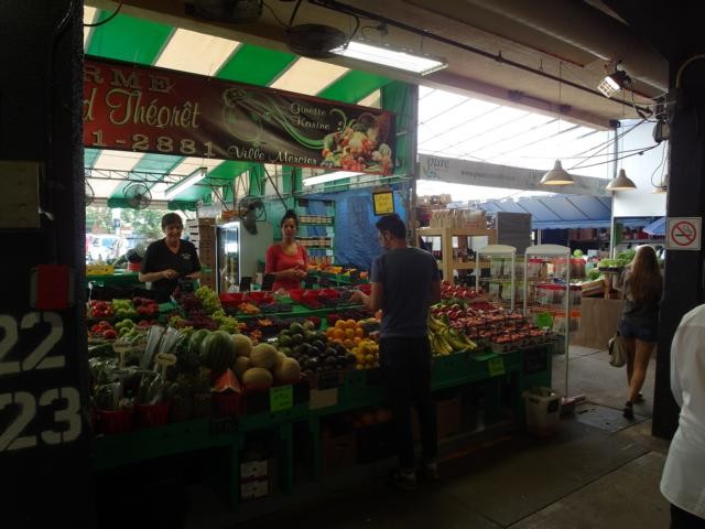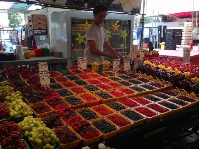 Nun machen wir uns zu dritt auf zum Fahrradstand am Parc La Fontaine und düsen den Fahrradhighway hinunter. Auch Marcel ist schnell begeistert von Montréal und dieser wunderbaren Fortbewegungsmöglichkeit. Noch vor Ablauf der ersten halben Stunde können wir unsere Räder wieder abstellen, so dass wir nichts bezahlen müssen. Wir gehen durch Vieux Montréal, weiter zum Einkaufszentrum Les Jardins und Marcel holt sich eine kanadische SIM-Karte. Dann nehmen wir uns wieder Fahrräder und los geht’s auf eine Tour am Canal de Lachine entlang. Es herrscht eine relaxte Ausflugsstimmung, überall sitzen Leute auf Bänken auf den grünen Uferwiesen, fahren auf Inlinern oder Fahrrad wie wir – man möchte fast denken, dass hier niemand arbeiten müsse. Gegen 13 Uhr kommen wir zum Atwater Market, stellen unsere Räder in die Station, bummeln über den bunten Markt – es gibt Blumen, Obst, alle Sorten der leckersten Beeren, Fleisch und zig Cafés und Imbissbuden. Wir genießen die klimatisierten Hallen, draußen ist es locker 30 Grad. Nach einer Lunchpause geht es weiter auf neuen Leihrädern.