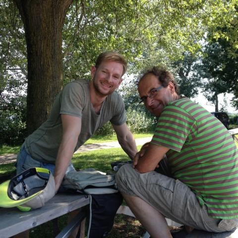 Durch ein Industriegebiet zum Sankt-Lorenz-Strom. Wir müssen eine lange Einkaufsstraße – eine Einbahnstraße – in falscher Richtung fahren, und dann geht es Kilometer weit am Strom entlang, wieder an grünen Wiesen entlang. Wow, es gibt hier so viel Platz! Selbst hier in Montréal bekommt man ein Gefühl von der unendlichen Weite Kanadas. Wir radeln zum Parc Rapides, da soll ein Strand zum Relaxen sein. Als wir ankommen, ist der Bereich geschlossen, wegen Überflutung. Das kennen wir ja schon aus Toronto. Wir wollen eine Decke ausbreiten und uns auf die Wiese legen. Es ist zu dreckig, alles voller Entenkot. So legen wir uns in den Schatten, auf schmale Holzbänke, die zum Picknick einladen, es ist etwas unbequem, wir schlafen trotzdem ein. Gegen vier Uhr denken wir ans Zurückfahren. Immer noch knallt die Sonne vom Himmel. Wir verfahren uns, landen plötzlich auf der Nachbarinsel Ile de Soeur, müssen etwa 10 Kilometer wieder zurück, verlieren die Orientierung und kommen erst um halb sechs völlig ausgelaugt wieder beim Atwater Market an. Diesmal besteht Dieter auf einer Pause. Manno, sind wir erschöpft! Und jetzt noch ganz durch die Altstadt zurück zu unserer Pension, mindestens noch einmal zehn Kilometer. Marcel hat eine Idee: Ein Uber-Taxi nehmen. Obwohl Dieter und ich dieses Geschäftsmodell moralisch total ablehnen, weil es langfristig gelernte Taxifahrer arbeitslos macht, willigen wir heute ein. Schon nach fünf Minuten holt uns ein Algerier ab und bringt uns für noch nicht einmal elf Euro in 15 Minuten nach Hause. Alles andere hätten wir nicht mehr geschafft.
