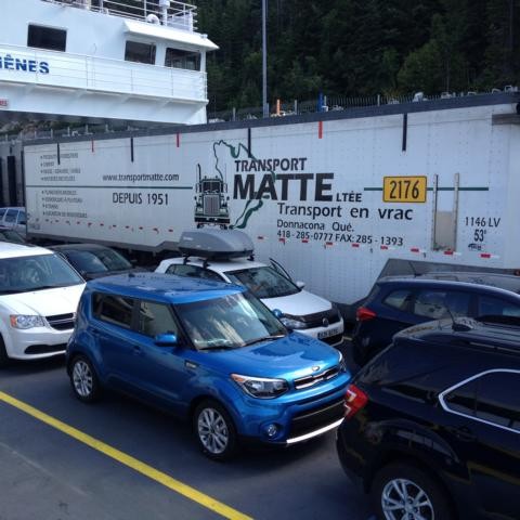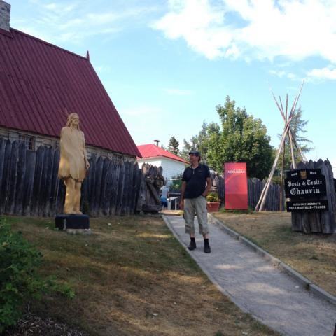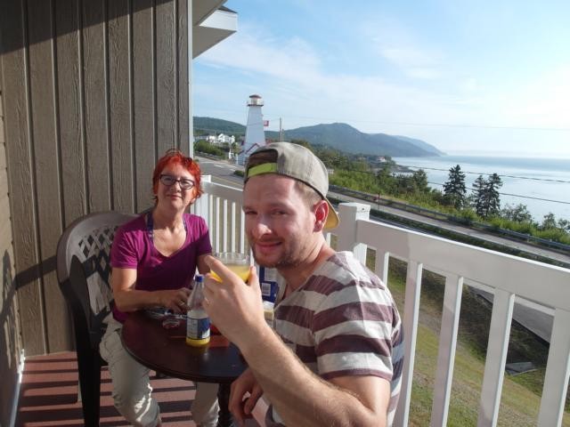 Auf dem Rückweg sehen wir ganz weit unten im Fjord etwas Silbrig-Weißes mal hier, mal dort aus dem Wasser springen. Das müssen wohl Beluga-Wale sein. Die sollen sich das ganze Jahr über hier im Fjord tummeln. Es sieht fröhlich, übermütig aus, es macht Spaß, ihnen – wenn auch nur durchs Fernglas – zuzuschauen. Nach vier Stunden Wandern treffen wir uns alle wieder. Marcel geht tatsächlich noch im Fjord baden. Eiskalt soll es sein. Dieter und ich verzichten lieber. Da es noch früh am Tag ist, beschließen wir, uns noch das Touristenörtchen Tadoussac auf der anderen Seite des Fjords anzuschauen. Wir müssen anderthalb Stunden nach Baie Saint Cathérine fahren und lassen uns von dort mit der Fähre übersetzen. Sie ist kostenfrei und die Überfahrt dauert gerade mal 10 Minuten. Tadoussac ist ein hübsches Örtchen mit vielen weißen Holzhäusern und roten Dächern, die von der Sonne beschienen einen starken Kontrast zum Blau des Himmels und des Wassers ergeben und einen heiter stimmen. Wir kommen an einem Hotel aus dem 19. Jahrhundert vorbei, das auf grüner Wiese mit weißen Stühlen zum Sitzen und Verweilen einlädt und schauen auf eine kleine ebenfalls in rot-weiß gehaltene Kirche, die Chapelle de Tadoussac. Sie entpuppt sich als die älteste Holzkirche Kanadas, die bereits 1747 erbaut wurde, und die auch von innen durch ihre Holzverkleidung ein geradezu gemütliches und beschützendes Ambiente bietet. Auch die neue Kirche wirkt mit moderner Architektur wohldurchdacht integriert in das rot-weiße Ensemble der sie umgebenden historischen Gebäude.
