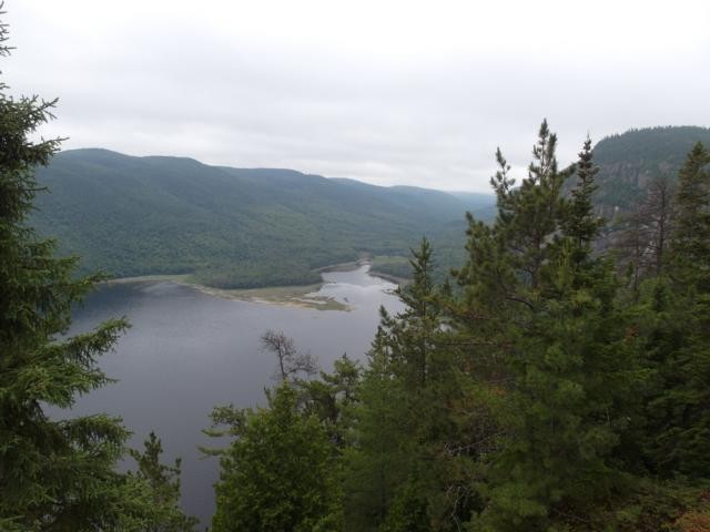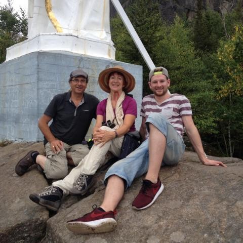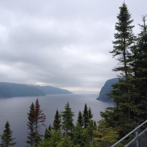 Geht auch, sind ja nur drei Nächte. Um neun Uhr machen wir uns auf in den Fjord-Saguenay-Nationalpark, etwa eine Stunde Fahrt von hier, auf einer gut ausgebauten Straße, rechts und links Wälder und Seen, die ersten Schilder, die vor Elchen warnen. In Rivière Eternité fahren wir von der Hauptstraße rechts ab, zücken unsere vorher georderten Nationalparkausweise, halten sie der Frau im Häuschen stolz entgegen – in diesem Jahr soll der Eintritt in die Nationalparks nämlich frei sein, weil Kanada 150 Jahre besteht – und: werden enttäuscht. Dieser Park gehöre “malheureusement” nicht zu den begünstigten. Wäre ja auch zu schön gewesen! Natürlich bezahlen wir brav und fahren vor bis zum Parkplatz. Eine Gruppe junger Leute begibt sich gerade mit ihrem Guide auf eine waghalsige Klettertour mit Überquerung einer schmalen Hängebrücke, 100 Meter Abgrund darunter. Wir haben die Bilder im Prospekt gesehen. Wir entscheiden uns für den leichteren Wanderweg zum Cap Trinité. Es geht gleich nach oben, über Steinstufen, Bretter, Holztreppen, immer aufwärts. Marcel ist schnell nicht mehr zu sehen. Dieter läuft auch oft außerhalb meiner Sichtweite, aber er wartet zum Glück an den Aussichtspunkten auf mich. Ich kann die Seele baumeln lassen, Frieden einatmen, Liebe ausatmen, wie Dieter Bednarz es in seinem jüngsten Buch “Schwer erleuchtet” so schön beschrieben hat. Die Bäume um mich herum und der Fjord dort unten strahlen eine erhabene Ruhe aus – Kanada Teil zwei hat begonnen. Nach etwa zwei Stunden, so gegen halb eins, haben wir das Ziel dieses Weges erreicht: die weiße Statue mit goldener Dornenkrone auf dem Kopf, Notre-Dame de Saguenay, die 1881 ein gewisser Charles-Napoléon Robitaille errichten ließ, nachdem er hier vor dem Ertrinken gerettet worden war.