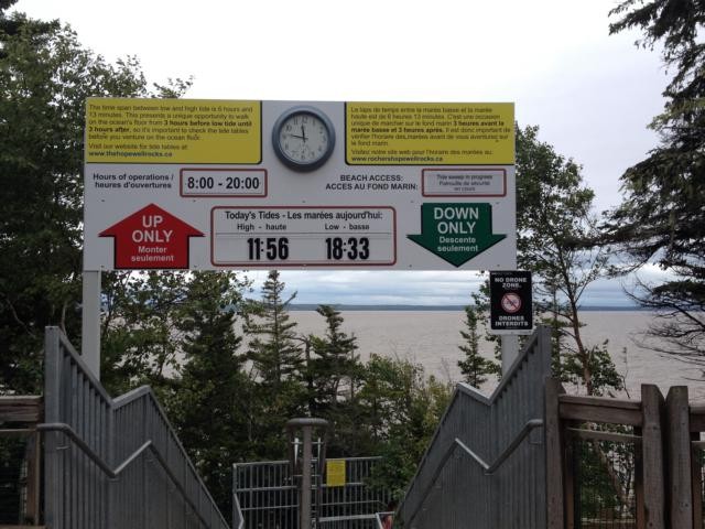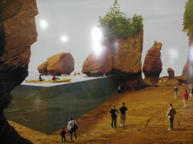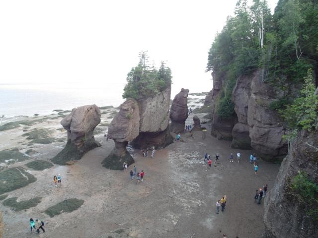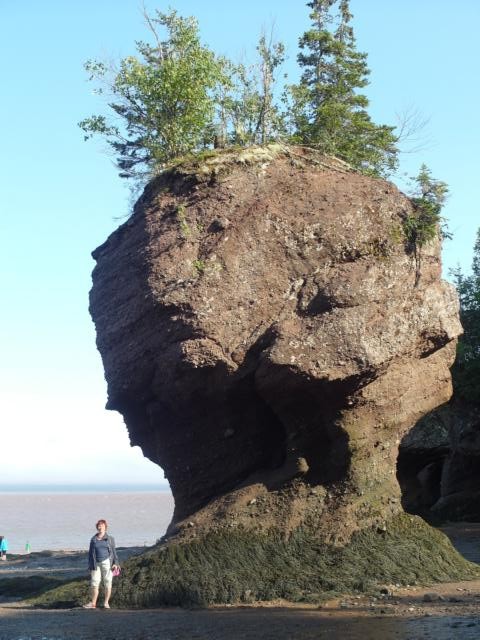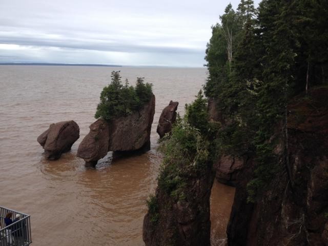 Dominik setzt sich zu uns und erzählt, dass sie dieses Haus geerbt haben, es immer was zu reparieren und zu renovieren gibt – ach was – und dass er nebenbei an der Straße gegenüber eine seltsame Spezialität zu verkaufen versucht: Eis mit Bacon. Er hat uns ein Bild seiner Kreation gezeigt, sieht gut aus, aber ich kann nicht sagen, dass mir danach das Wasser im Munde zusammenläuft. Es regnet immer noch, aber nachmittags soll es besser werden. Wir beschließen, zuerst zu den Hopewell Rocks zu fahren, ein Ort, an dem es den höchsten Tidenhub der Welt gibt. Mit vielen anderen Touris aus allen Kontinenten laufen wir, nachdem wir Eintritt bezahlt haben, den Weg zu den Aussichtspunkten hinunter. Es ist gerade Flut, wir sehen von Wasser umspülte Felsenspitzen aus dem Meer ragen. Nach sechs Stunden soll man dort unten gemütlich spazieren gehen können, bis zu 18 Metern könne hier der Wasserstandsunterschied von Ebbe und Flut betragen, heißt es in einem Prospekt. Wir wollen hier nicht sechs Stunden verweilen, sondern lieber abends noch einmal wiederkommen.
