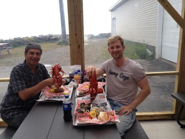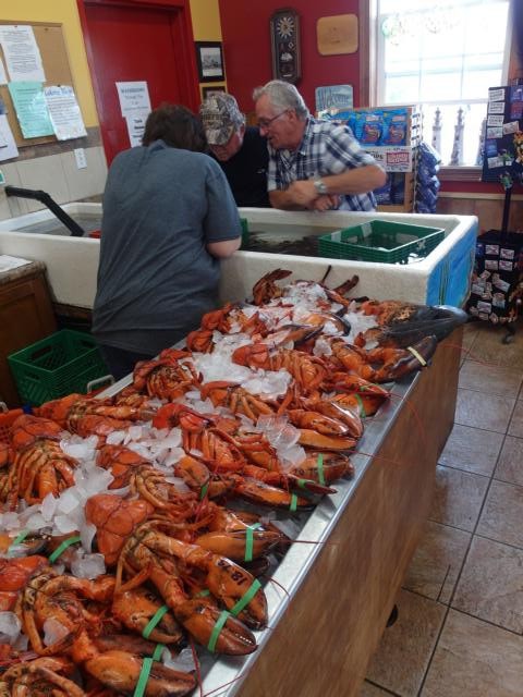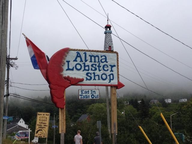 Dazu müssen wir zum Glück nicht doppelt bezahlen, prima! Wir fahren in das etwa 40 km entfernte Touristenörtchen Alma. Es hat inzwischen aufgehört zu regnen, ist zwar noch neblig, aber langsam schiebt sich die Sonne durch. An jeder Ecke wird Lobster angeboten. Alma ist die kanadische Lobsterstadt schlechthin, alle Hotels und B&Bs sind Monate im Voraus ausgebucht. Wir gehen zu Almas “Lobster Shop, eat in or take out” und kommen aus dem Staunen gar nicht mehr heraus. Wie bei uns in Imbissstuben Pommes mit Ketchup wird hier Hummer angeboten, zum Mitnehmen und als Picknick zu verspeisen, zum Selbstzubereiten oder zum Verzehr im Restaurant. Wir suchen uns ein Plätzchen in der Lobsterbude, Dieter und Marcel gehen die für uns richtige Größe aussuchen, und ich schaue mir schon mal an, wie die Leute um mich herum die Tiere verspeisen. Das Werkzeug wird also mitgeliefert, es gibt ein Waschbecken, wo man sich hinterher mit Seife die Hände wäscht. Mein Gott, was sind das für Oschies, an denen die Leute herumwerkeln! Ich habe noch nie so große und vor allem so viele Hummer auf einmal gesehen! Dann kommt unser Essen, und wir machen es wie alle.