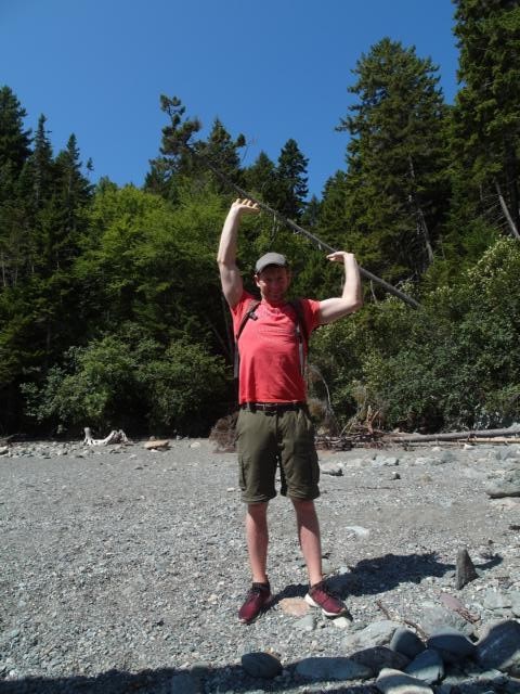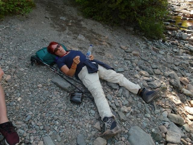 Mit neuer Energie geht es weiter. Zuerst am Fluss entlang, auf Felsen balancierend, wenigstens ist der Weg gut markiert, dann wieder mehr in den Wald hinein. Über uns kanadische Balsamtannen und Weißfichten. Als ich mich einmal an einem Ast hochziehe, bekomme ich harzige Finger, es klebt an meinen Wanderstöcken. “Ablutschen, Spucke drauf” meinen Dieter und Marcel fast gleichzeitig. Es hilft. Um ungefähr 16 Uhr überholen uns immer mehr Leute. “Das kann doch nicht angehen” mault Marcel. Aber ich brauche eine Pause.
