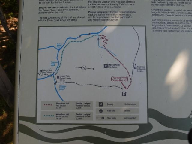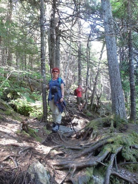 Die Vegetation kommt uns vertraut vor, unten, wo es feucht ist, Farne, weiter oben Tannen, Fichten, Ahorn und Birken. Wir fahren weiter zu dem dritten und nach Aussage der Nationalparkmitarbeiterin schönsten Wandergebiet des Parks, dem Laverty. Dorthin gelangen wir mit dem Auto über eine acht Kilometer lange Schotterpiste. Zum Glück habe ich meine Wanderstöcke dabei und gegen 14 Uhr geht es den Moosehorn Trail hinunter. Über Stock und Stein, über große und kleine Wurzeln, immer bergab. Man muss sich konzentrieren, um nicht zu stolpern. Wir mögen das.