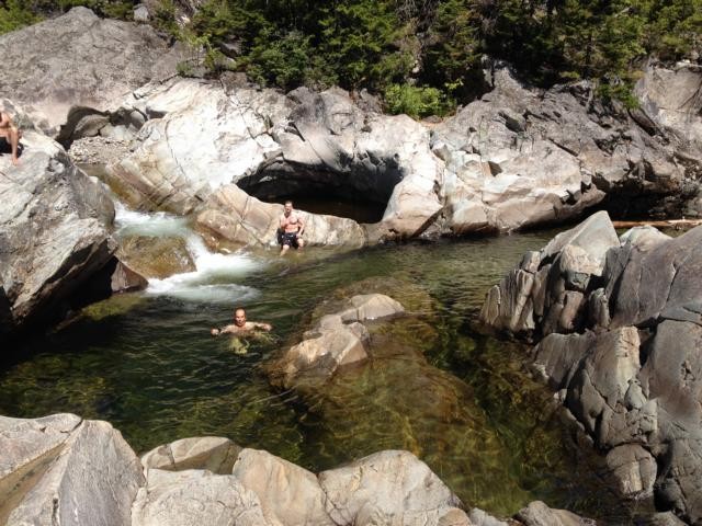 Es ist halt nicht Spazierengehen,sondern Wandern mit Klettern. Nach, wie es uns scheint, endlosen Kilometern bergab, hören wir in der Ferne johlende Stimmen. Da wird gebadet, los, da wollen wir hin. Der Weg ist immer noch steinig, geht immer noch bergab, wir schwitzen, brauchen noch mindestens eine halbe Stunde. Dann erreichen wir die ersehnten Badegumpen am Wasserfall. Etwa 20 andere Wanderer genießen schon das kühlende Bad oder sitzen auf den Felsen, und gucken, wer so alles kommt. Auch Marcel ist natürlich schon lange vor uns da: “Geil hier!” Dieter ist blitzschnell in Badehose und im Wasser:”Überhaupt nicht kalt!”