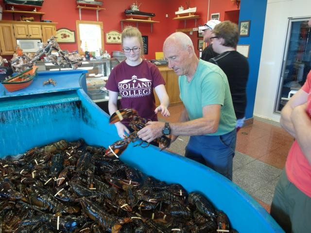 Wir ruhen uns am Fluss unten eine halbe Stunde aus, und ich bin richtig eingeschlafen. Dann geht es an das letzte Drittel, nur noch bergauf, steil bergauf, so wie wir am Anfang abgestiegen sind. Marcel läuft vor. Dieter und ich geben unser Bestes. Jetzt überholen auch wir mehrere Wanderer und schaffen den Aufstieg in weniger als einer Stunde. Das war geradezu Hochleistungssport. Zufrieden und erschöpft fahren wir zurück nach Alma, um ein paar Einkäufe zu erledigen, vor allem, um Dominik und uns für heute Abend Lobster mitzubringen. Wir sollen sie ihm lebend bringen. Wir betreten Collin’s Lobster Shop, und sehen, dass auch Philippe aus unserem B&B gerade dort ist und in einem riesigen Becken voller lebender Hummer nach einem greift.