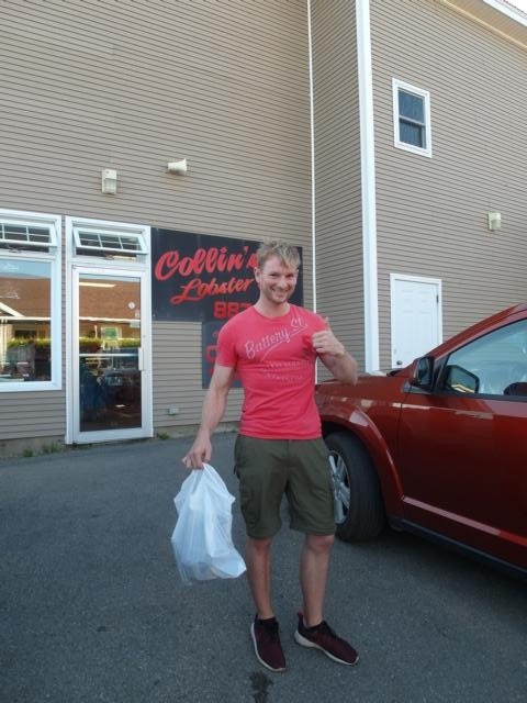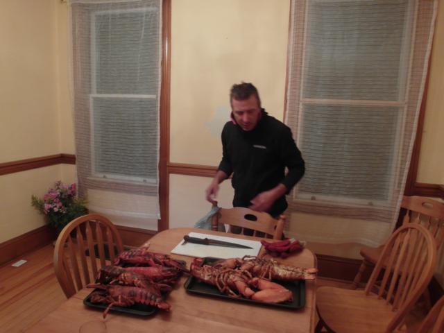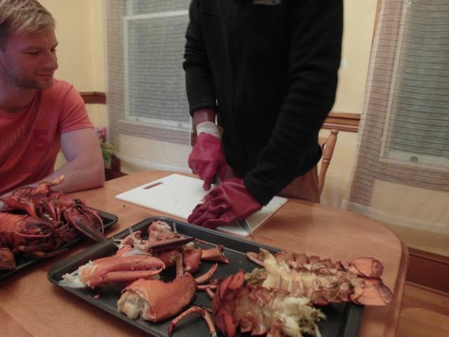 Wir staunen, Mensch, die beißen doch! Da kommt auch schon eine fachkundige Verkäuferin und fragt, wie groß wir sie denn gern hätten. Wir suchen uns vier eher kleine aus, zusammen bringen sie 7,4 pounds auf die Waage, also etwa 3,4 kg, Philippe nimmt zwei größere. Sie werden in eine Plastiktüte gesteckt, und so sollen wir sie die 30 km im Auto nach Hause fahren. Marcel wird auserwählt, die Tüte zu tragen. Er lässt sich eine zweite geben, darf sich mit seinen Begleitern im Auto nach vorn setzen, und wir hoffen, dass keines der köstlichen Meerestiere auf die Idee kommt, seine Umhüllung zu verlassen und im Kia herumzukrabbeln, oder auch nur die Tüte durchzubeißen und so den schönen Neuwagengeruch für alle Zeiten mit fischigem Lobsteraroma zu veredeln. Wir schaffen es, Dominik unser Abendbrot heil abzuliefern und schauen ihm dabei zu, wie er sie ab- und anrichtet. Warum bin ich eigentlich immer noch nicht Vegetarierin?