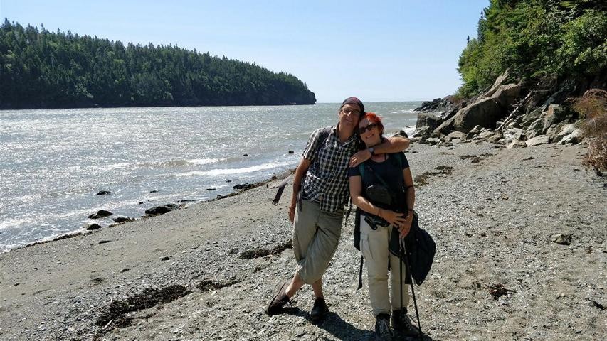Beim Frühstück lernen wir Brigitte und Philippe kennen, sie leben zusammen in Ottawa, Brigitte ist Kanadierin, Philippe kommt ursprünglich aus Lyon, in Frankreich, hat dann 25 Jahre in den USA gelebt, zwei Kinder und eine Exfrau dort, bis er, heute 73, Brigitte kennengelernt hat, die ich auf etwa 50 schätze. Sie haben zusammen eine 23-jährige Tochter. Wir sind uns sympathisch. Draußen scheint die Sonne, also nichts wie raus, in den Fundy Nationalpark. Heute ist Wandern angesagt. Im Informationszentrum gibt uns eine äußerst charmante Mitarbeiterin Tipps zu den besten Wegen. Als erstes geht es zum Point Wolfe Gebiet und den Coppermine Trail entlang. Hier wurde wohl mal Kupfer abgebaut, woran heute aber nur noch der Name erinnert. Wir wandern etwa anderthalb Stunden durch einen nach Tannen und Fichten duftenden, wunderbar frischen Mischwald. Das macht sofort gute Laune. Nach einem längeren Abstieg erreichen wir über eine Holzbrücke den Pointe Wolfe Beach. Es ist Hochwasser, also nur ein schmaler Streifen zum Laufen am Strand.