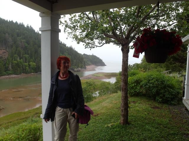 Wir wussten, dass es heute regnen würde. Beim Frühstück ist es grau und bewölkt und deutlich kühler als gestern. Gegen halb zwölf brechen wir auf zum Fundy Trail Park. Dort soll man unter anderem mit dem Auto 13 Kilometer lang von einem Aussichtspunkt zum nächsten fahren können. Wir bezahlen 8,50 CAD pro Person und sind drin. Trotz leichten Nieselregens können wir weit über die Fundy Bay blicken. Es ist ziemlich leer hier an einem ganz normalen Dienstag. Ob das wohl immer so ist? Dieter meint, dass es bei Sonnenschein und am Wochenende hier boomen würde. Na hoffentlich! Es ist schließlich eine großartige Idee, allen Menschen einen Zugang zu ansonsten unberührter Natur mit grandiosen Ausblicken, häufig sogar barrierefrei, zu ermöglichen. Wir halten an den Grabstätten der ersten Siedlerfamilien aus dem 18. und 19. Jahrhundert, die es hier mit dem Bau von Schiffen zu Wohlstand gebracht haben. Schön, dass auch die Frauen hier alt geworden sind und geehrt werden! Im Informationszentrum des Parks, der im übrigen nicht zum Fundy Nationalpark gehört (deshalb auch die Eintrittsgebühren), werden wir freudigst begrüßt und gefragt, wo wir denn herkämen. Als wir Deutschland sagen, staunen sie. “From so far away!”