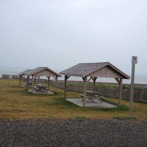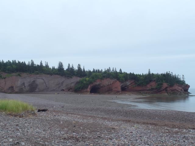 Wir haben bisher tatsächlich erst eine deutsche Familie gesehen, bei den Hopewell Rocks, wir sind hier also eine besondere Spezie. Wir werden sogleich eingeladen, uns einen Videofilm über den Park anzuschauen. Mit vier anderen Touris lassen wir uns das, was wir vor der Tür live sehen, noch einmal als Film mit Musik unterlegt, vorführen. Auf dem Trail gibt es etwa zehn ausgewiesene Viewpoints. Wir machen Halt am “Long Beach”, einem schönen Strand, an dem überdachte und freistehende Picknicktische zum Verweilen einladen. Doch heute herrscht eine gähnende Leere.