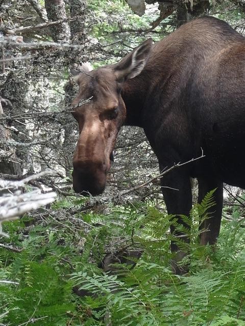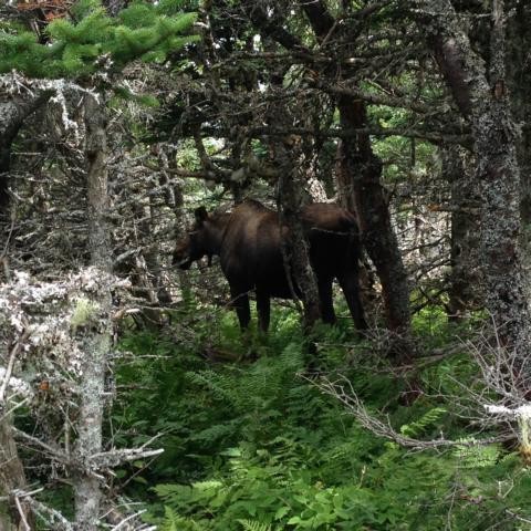 Mein Gott, und schon so viele Fotoklicks mussten die beiden ertragen! Natürlich halten auch wir es mit der Kamera fest, gehen dann aber schnell weiter. Die Elchmutter hat bestimmt Angst vor uns gehabt. Nach einer weiteren halben Stunde kommen wir auf das Stück Weges, wofür der Skyline Trail berühmt ist: wir genießen eine wunderbare Panorama-Aussicht vom Kamm eines Berges hinab. Alles ist mit Holzbohlen und Treppen ausgebaut. Es ist schön dort oben, wir verweilen auf einer Bank, meinen unten im Meer wieder Wale durchs Fernglas zu erspähen – ganz sicher sind wir aber nicht – und gehen nach einer Weile zurück.