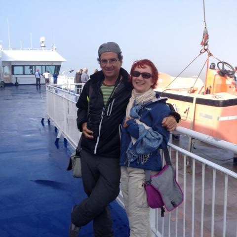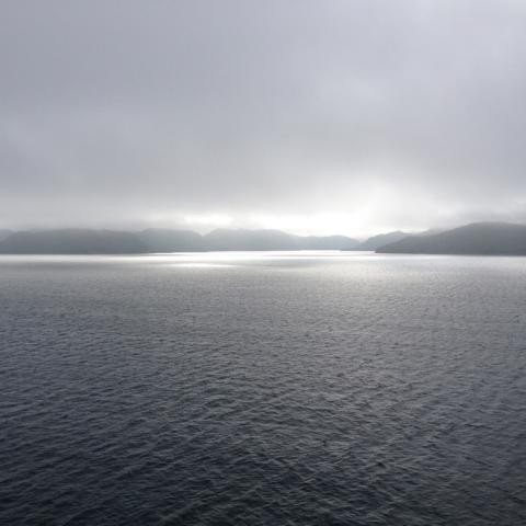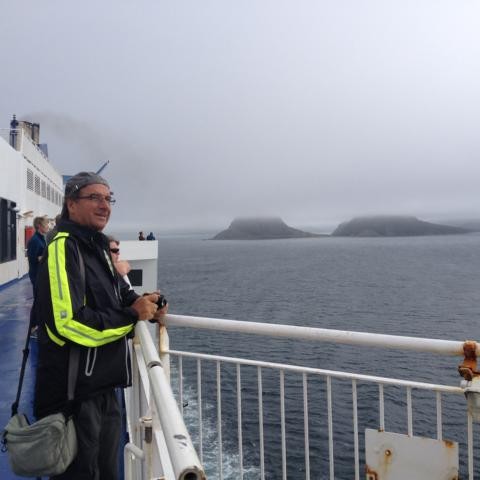 Unser Wecker klingelt um halb sechs. Es ist grau und diesig überm Wasser, und ab und zu ertönt ein Nebelhorn, aber es klingt wie aus weiter Ferne, unsere Kabine ist gut isoliert. Wir duschen mit warmem Wasser, das Schiff ist ein Luxushotel. Wahnsinn! Um halb sieben sind wir so ziemlich die ersten am Frühstückskiosk, merkwürdig! Ich sehe eine Uhr, sie zeigt auf sieben. Sollten wir da nicht ankommen? Die Kassiererin klärt mich auf: Neufundlandzeit ist eine halbe Stunde später, und ankommen werden wir gegen 10 Uhr. Na sowas! Da hätten wir ja gar nicht so früh aufstehen brauchen! Auf unseren Tickets stand als Ankunftszeit doch sieben Uhr, oder? Um 9:15 Uhr fahren wir in eine Bucht. Auf der einen Seite, es muss Süden sein, sehe ich das erste Haus auf einer Landzunge. Auf der anderen Berge und Felsgruppen, alles im Nebel, doch hin und wieder kommt die Sonne durch.