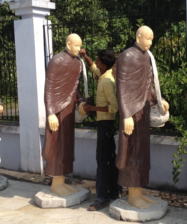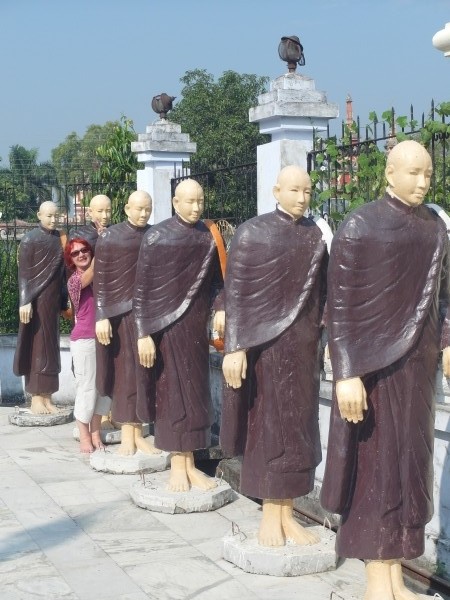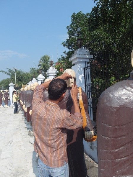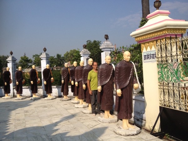 Wir konnten uns heute mit allem Zeit lassen. Anscheinend waren wir die einzigen, die für Kuschinagar zwei Übernachtungen gebucht hatten. Unserem Fahrer, der ja auch hier übernachten musste, winkten wir freundlich zu und liefen nach dem Frühstück zum zweiten Mal die Dorfstraße entlang, vorbei an den ganzen Tempeln. Wir wurden angestarrt wie ein Weltwunder. Eine Familie aus Bangladesch wollte sich unbedingt mit uns fotografieren lassen. Kleine Kinder schlossen sich uns an, teilweise von ihren Müttern zum Betteln geschickt, aber Geld haben wir ihnen nicht gegeben. Es nützt ja eh nichts! Wir haben uns noch den chinesischen Tempel angeschaut: da liefen lauter mannshohe Mönchsfiguren, die gerade von Stuckateuren bearbeitet wurden, im Uhrzeigersinn herum.
