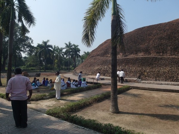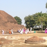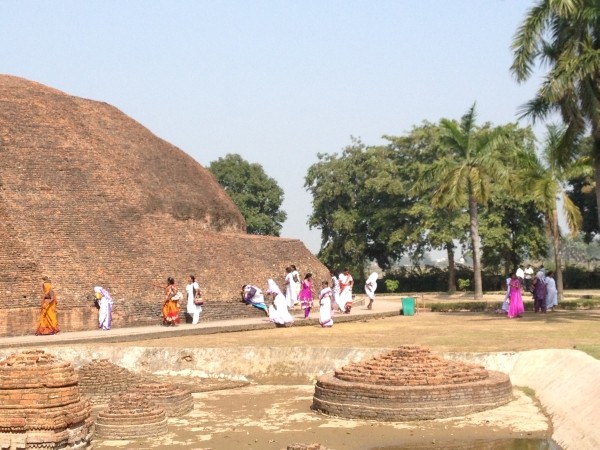 Zurück auf der Straße wartete unser Fahrer auf uns. Er sah es wohl als seine Aufgabe an, darauf zu achten, dass wir nicht so “weite” Wege (immerhin zehn Minuten!) zu Fuß laufen. Wenn der wüsste, dass wir in Nepal sieben Stunden am Tag gewandert sind! Wir erklärten ihm, dass wir uns noch für ‘ne halbe Stunde in den Park setzen würden, er uns danach aber gern wieder fahren könnte. Er fuhr uns zu einer Gedenkstätte, wo Buddha einst verbrannt wurde. Dort war gerade eine Gruppe Inder zugegen, die sich alle nacheinander, Frauen und Männer getrennt, ehrfurchtsvoll vor den roten Backsteinen niederknieten und verneigten.