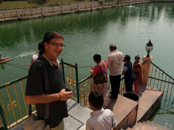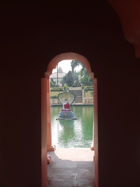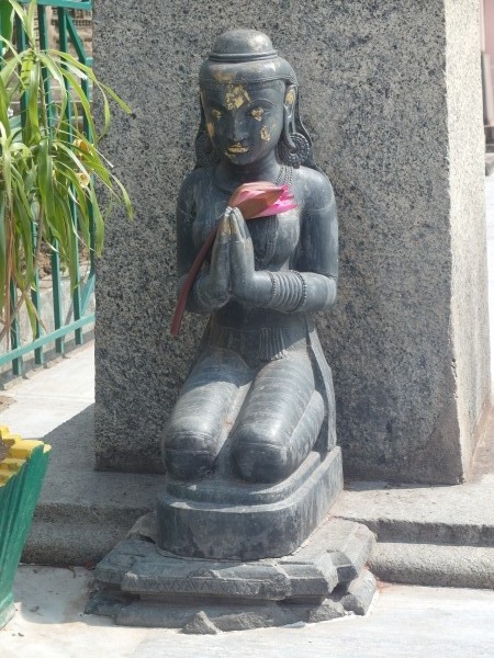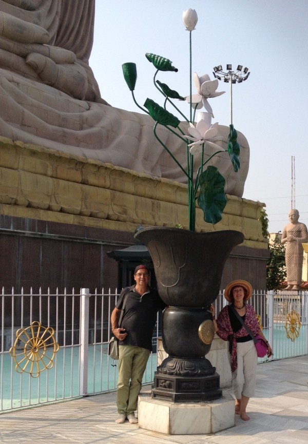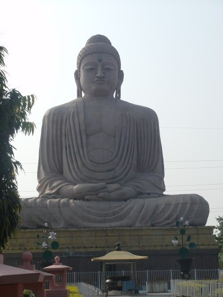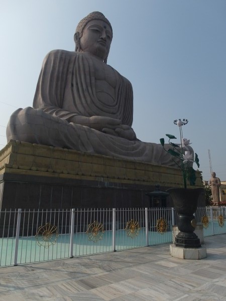 Als wir im Meditationsgarten waren – Extra-Eintritt 25 Rupien das sind etwa 20 Cent – schallte laut Musik herüber. Ein kleiner Hinweis auf die von Hindus und Buddhisten unterschiedliche Lebensart ihrer Religion? Hindus sehen den Tempel zwar auch als Heiligtum an, da sie Buddha als Reinkarnation ihres Gottes Vishnu interpretieren, aber sie zelebrieren ihre Verehrung gern laut nach außen hin, Buddhisten in sich gekehrt und leise. Außerdem, so hat Lal uns erzählt, werde gerade zwei Tage lang das hinduistische Chath-Puja-Fest, das größte im Staat Bihar, gefeiert. Nach 24 Stunden Fasten tragen Frauen in Prozessionen ein Gefäß mit Wasser zum Ort der Feierlichkeiten. Es wird dem Sonnengott gehuldigt und eine neue Erntezeit eingeläutet. War die ohrenbetäubend laute Musik schon ein Vorbote dieses Festes? Natürlich haben wir uns auch die riesige, 25 Meter hohe Buddha-Statue aus Sandstein angeschaut, die 1989 vom Dalai Lama enthüllt wurde. Bombastisch, ein Fundamentalbau für die nächsten 2500 Jahre. Einzig zwei Laternen in Form von Lotuspflanzen rechts und links vom Eingang hatten etwas Verspieltes.