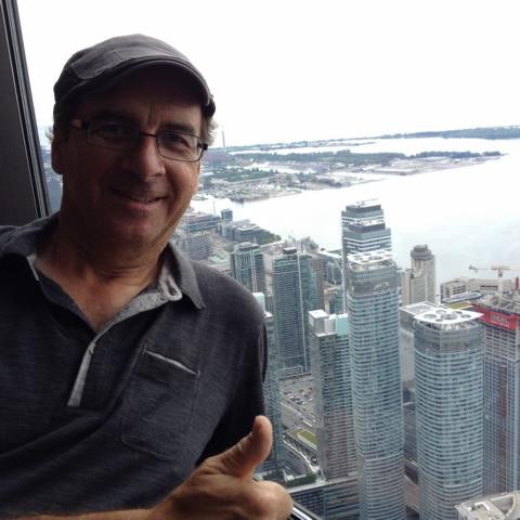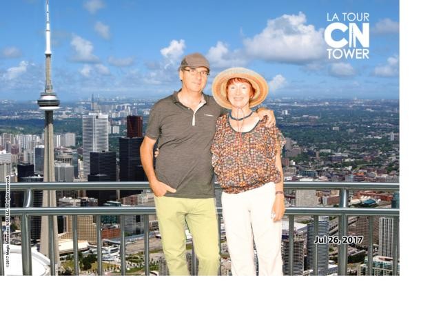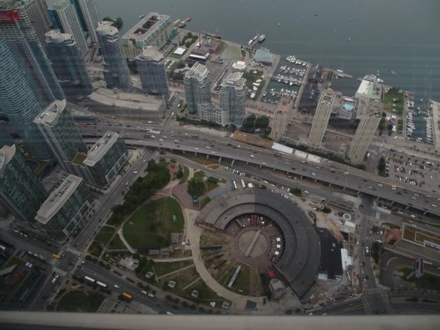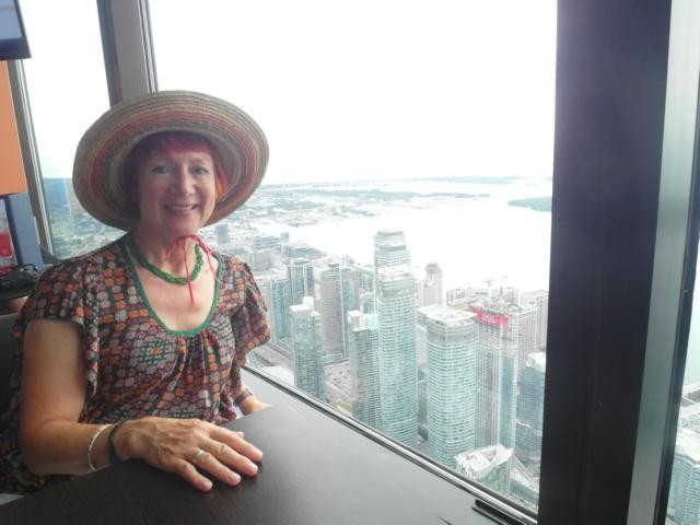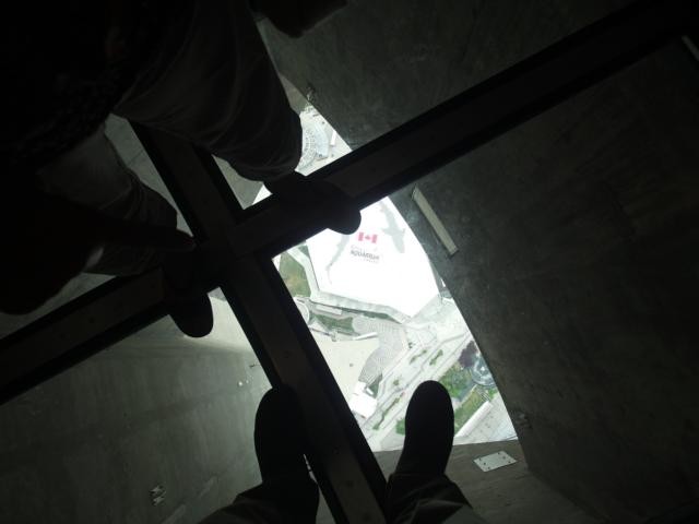 Der Tag beginnt mit Michelles leckerem Frühstück und heute ist Melina aus Griechenland als neuer Gast dabei. Sie wird vier Tage hier bleiben, man wird sich also noch begegnen. Wir haben uns eine Tageskarte für den Nahverkehr besorgt und sind mit der Subway vom College nach St. Andrew gefahren. Geht wunderbar, die Bahn ist nicht überfüllt und äußerst schnell. Dann zu Fuß zum CN Tower. Um zehn haben wir unsere Tickets und schon geht es im Fahrstuhl aufwärts. Man kann nach draußen und nach unten schauen, muss man aber nicht. Auf 351 Metern sind wir raus.
