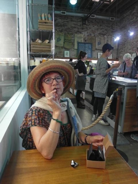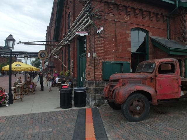 Wir sind dann Bus gefahren. Auch das ist unkompliziert und bequem in Toronto. Zur Destillerie, einer ehemaligen Schnapsbrennerei, die zum Kulturzentrum umgebaut wurde. Das ganze Areal erinnert an Barmbek, an den Platz um das Museum der Arbeit. Alle Gebäude sind wie dort aus roten Ziegelsteinen gebaut. Galerien, Kaffeehäuser, Schmuck- und Kunsthandwerkerläden, Biokosmetik, auch eine Desigual-Filiale und ein Theater, in dem tatsächlich zweimal täglich Vorstellungen laufen, die selbst um 14 Uhr gut besucht sind. Wir kommen an einer Chocolaterie vorbei, kaufen uns sechs Pralinen aus feinster Zartbitterschokolade und lassen uns diese Delikatessen genüsslich und langsam auf der Zunge zergehen. Superlecker!